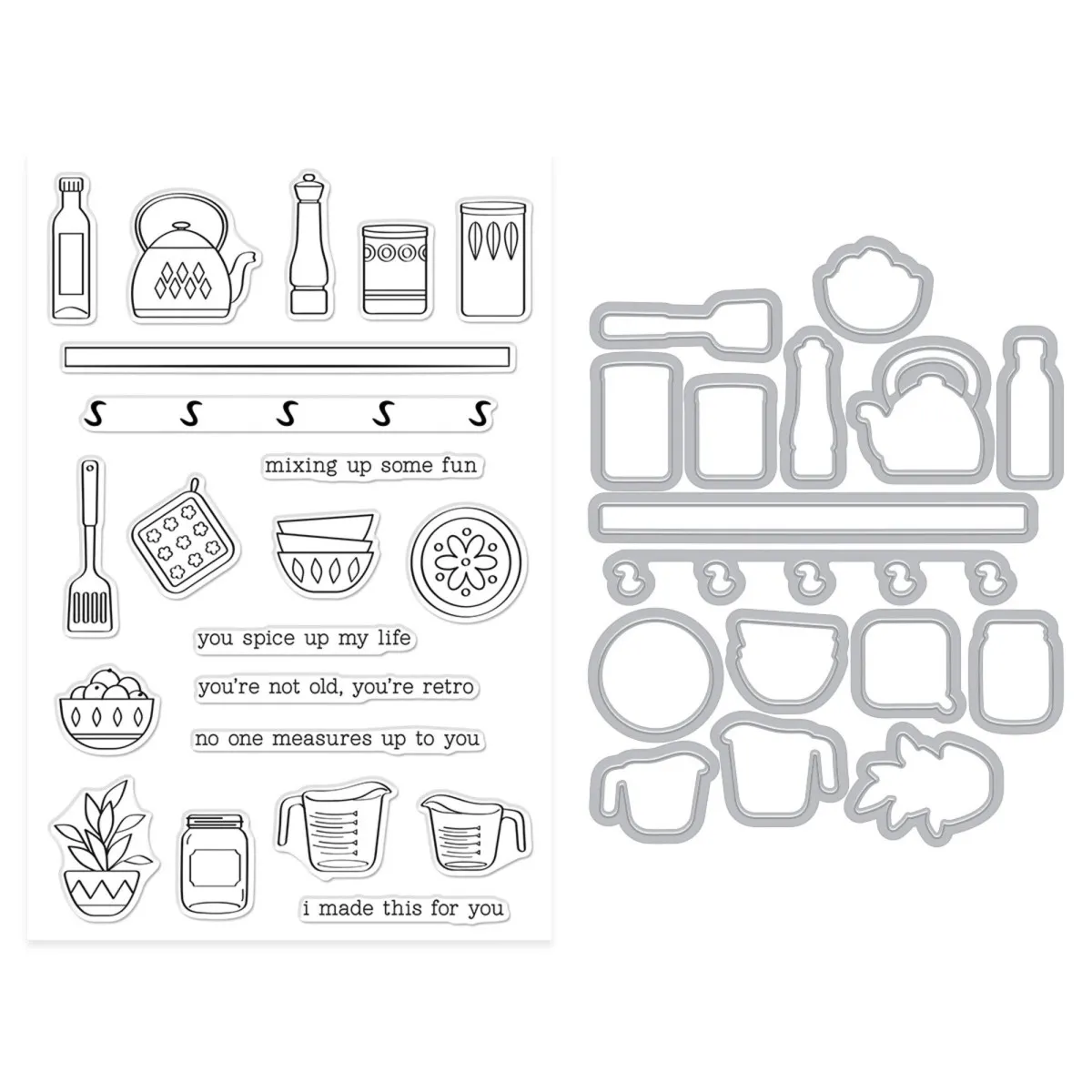 Das On The Shelf Stamp & Cut Set aus der Retro Kitchen Collection bringt dir das perfekte Küchenregal direkt auf deine Bastelprojekte – einfach aufstempeln! Dieses Set besteht aus 21 Clear Stamps und enthält ein Regal mit einer Reihe von Haken sowie jede Menge Zubehör, um es individuell zu füllen. Von Pfannenwendern und Teekannen bis hin zu Schüsseln und Tellern – du wirst es lieben, dieses Küchen-Basic nach deinen Vorstellungen zu gestalten.
