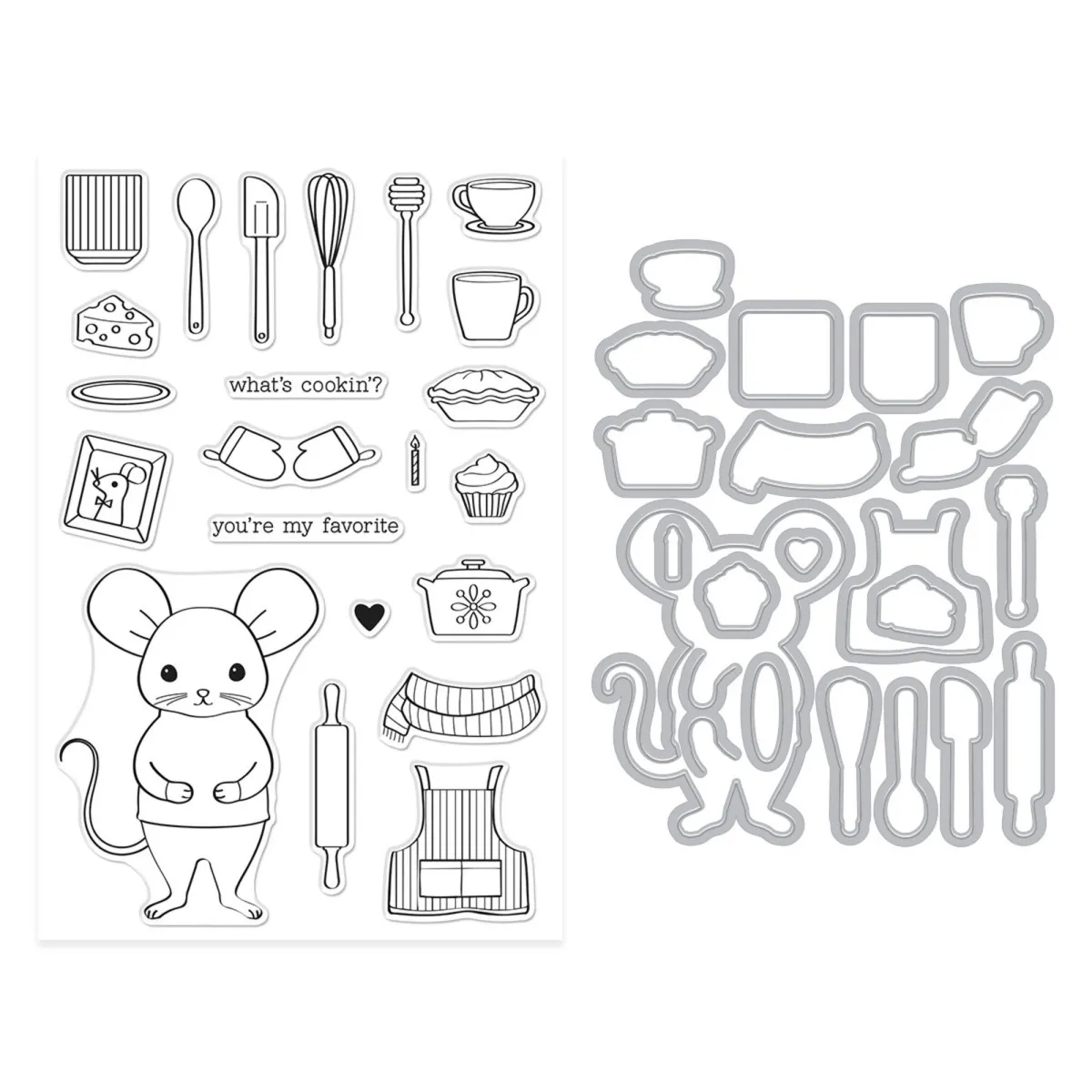 Dieses Set enthält sowohl das Clear Stamp Set als auch die passenden Stanzformen – so kannst du die Elemente ganz einfach ausschneiden und weiterverarbeiten. Die Maus passt übrigens perfekt zu den DF246 Classic Cabinet Dies und sorgt für eine besonders charmante Küchenkulisse.