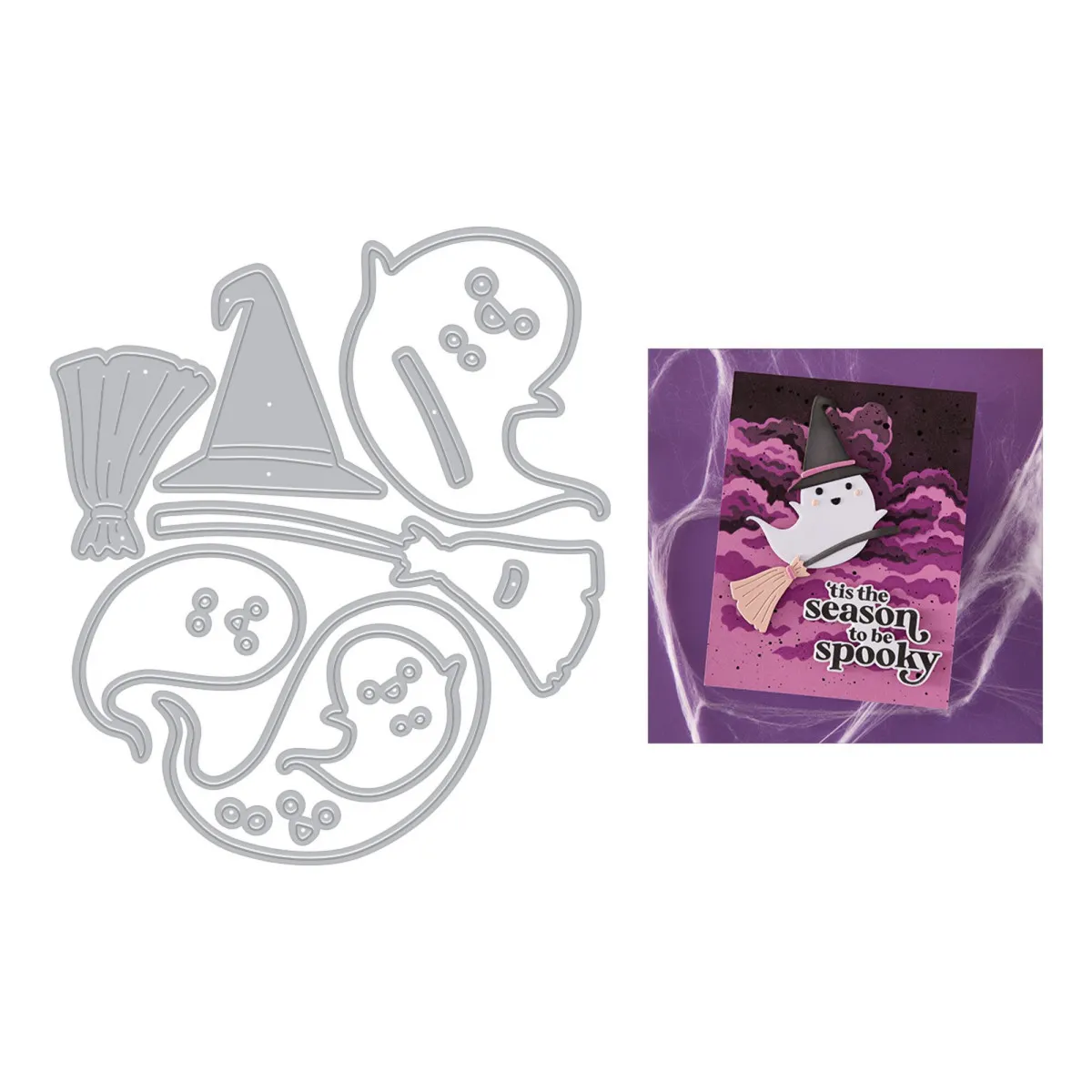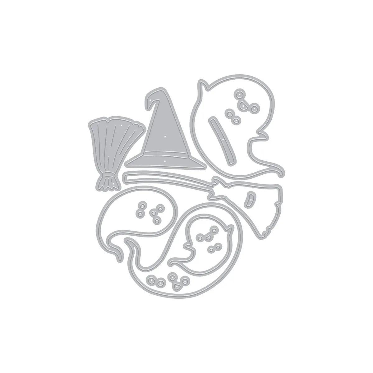 Kombiniere die Elemente, um deine eigene Geistercrew zu gestalten – füge Rouge, süß-spukige Augen und verspielte Accessoires hinzu, um jedem Geist eine eigene Persönlichkeit zu geben. Egal, ob du mit Kindern bastelst oder handgemachte Halloween-Grüße verschickst, dieses Set ist ein Muss für deine Halloween-Sammlung.