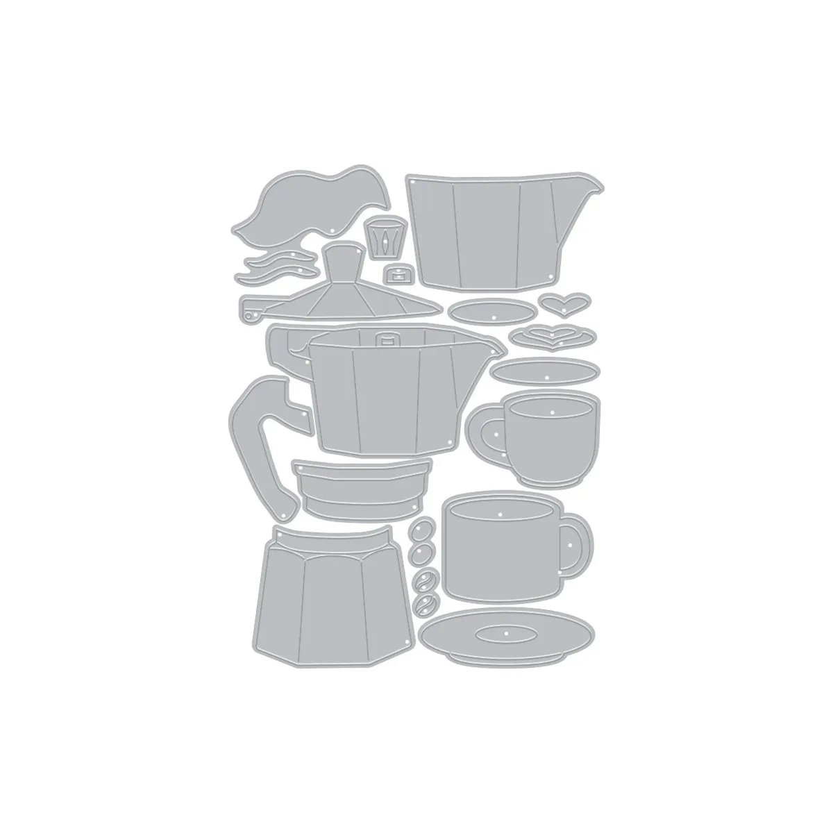 Stovetop Espresso Etched Dies aus der What’s Brewing? Collection sorgen garantiert für deinen Koffein-Kick! Dieses Set aus 18 geätzten Stanzformen setzt sich zu einer klassischen Espressokanne für den Herd zusammen, dazu gibt es zwei Tassen, um deinen Kaffee zu genießen. Jede Tasse zeigt süße Latte Art und verführerischen Dampf, außerdem sind ein paar Kaffeebohnen zum Dekorieren dabei. Dieses detaillierte Set bringt dich so richtig in Schwung!