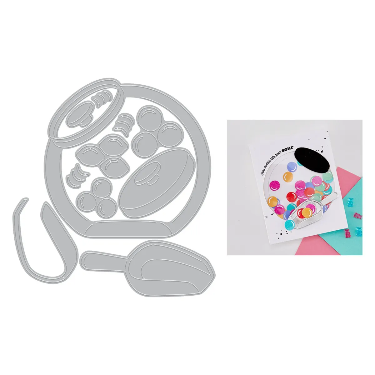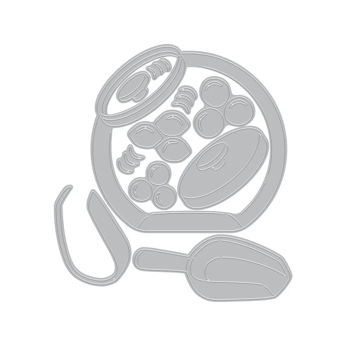 Gestalte die süßesten Süßwarenladen-Szenen mit dem Penny Candy Jar Stanzformenset. Dieses Set enthält ein rundes Bonbonglas, einen Deckel, eine Schaufel und süße Bonbon-Details, die für einen charmanten, dimensionalen Look übereinander geschichtet werden können.