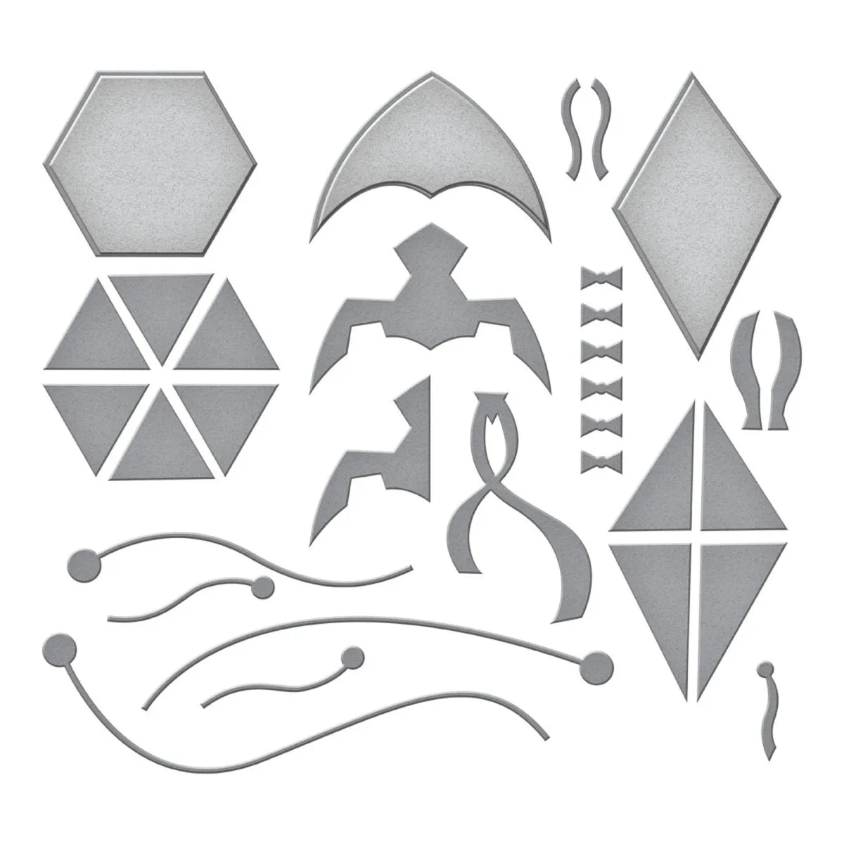 Fly a Kite Etched Dies stammen aus der Sky's the Limit Collection von Simon Hurley. Mit diesem Set aus 18 dünnen Metall-Schneide-Stanzen kannst du drei verschiedene Drachenformen (Raute, Hexagon und Rochen) mit ihrem Schweif erstellen. Der fertige Raute-Drachen misst ca. 4,40 x 12,80 cm, der fertige Hexagon-Drachen ist ca. 6,00 x 10,30 cm groß und der fertige "Rochen"-Drachen misst ca. 6,60 x 6,00 cm.