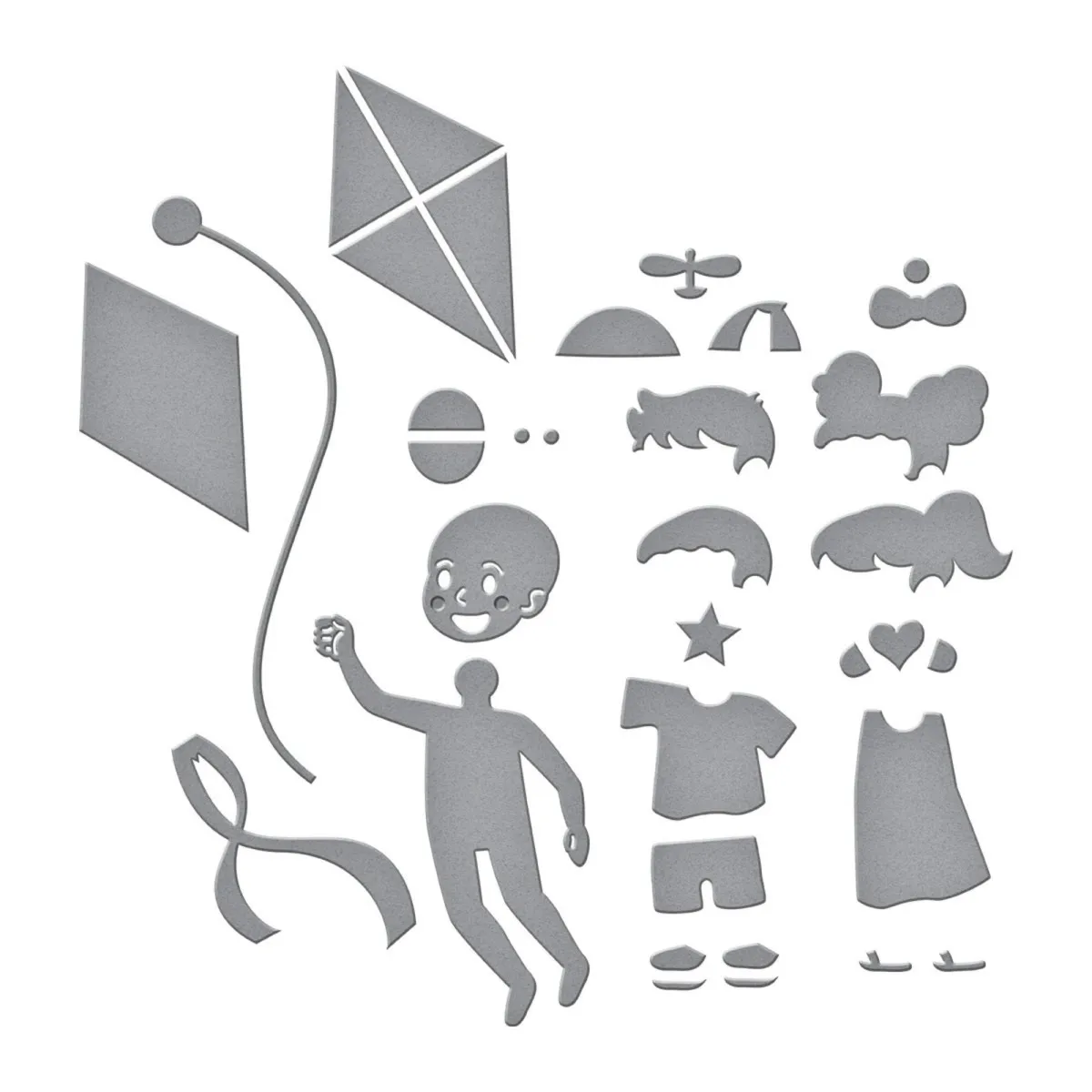 Up and Away Etched Dies sind Teil der Sky's the Limit Collection von Simon Hurley. Wenn sie zusammengebaut sind, kann dieses Set aus 19 dünnen Metall-Schneide-Stanzen Kinder, Drachen und sogar eine Propellerkappe erstellen! Du kannst jedes Design einzeln verwenden oder eine Vielzahl auf einem Projekt kombinieren... viele Designideen! Der fertige Drachen mit Kind misst ca. 8,70 x 12,30 cm, und das fertige Kind ist ca. 4,20 x 7,20 cm groß.