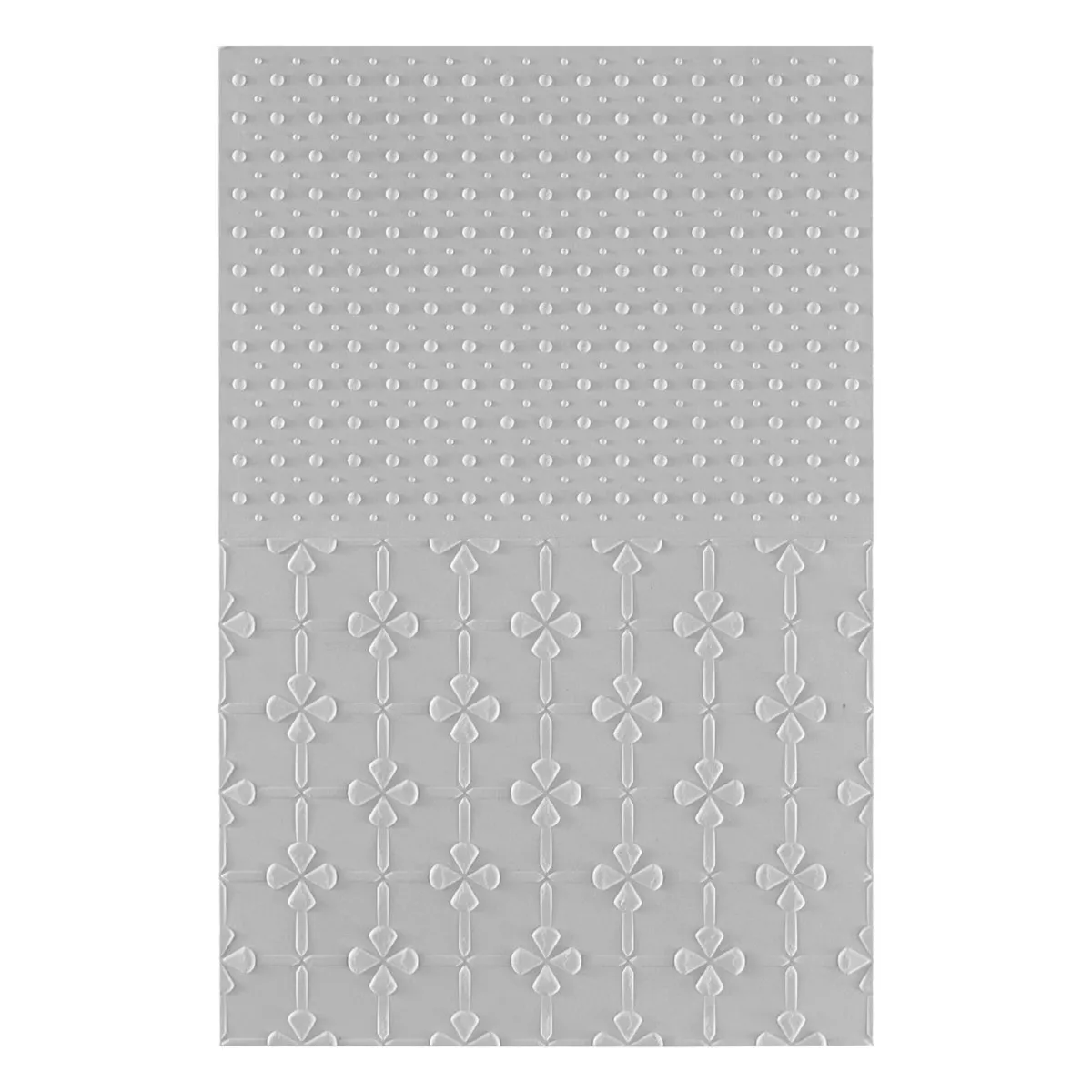 Polka Dot & Posy Duo 3D Embossing Folder ist ein 13,97 x 21,60 cm (5.50 x 8.50 Zoll) Prägefolder, der mit zwei verschiedenen Designs in einem einzigartig ist! Eine Hälfte zeigt Blumen auf einem Rasterhintergrund, die andere ein Polka-Dot-Motiv mit kleinen und großen Punkten. Du kannst dein geprägtes Panel in der Mitte teilen, um zwei A2-Kartenfronten (10,80 x 13,97 cm / 4.25 x 5.5 Zoll) zu erstellen, oder es so lassen, wie es ist – so clever!