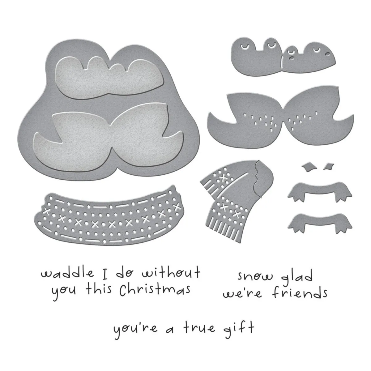 Das Cozy Waddles Clear Stamp & Die Set gehört zur Merry Mischief Collection. Gestalte ein niedliches Pinguin-Paar mit den sechs dünnen Metall-Stanzformen, inklusive Schal, damit sie kuschelig zusammenbleiben.