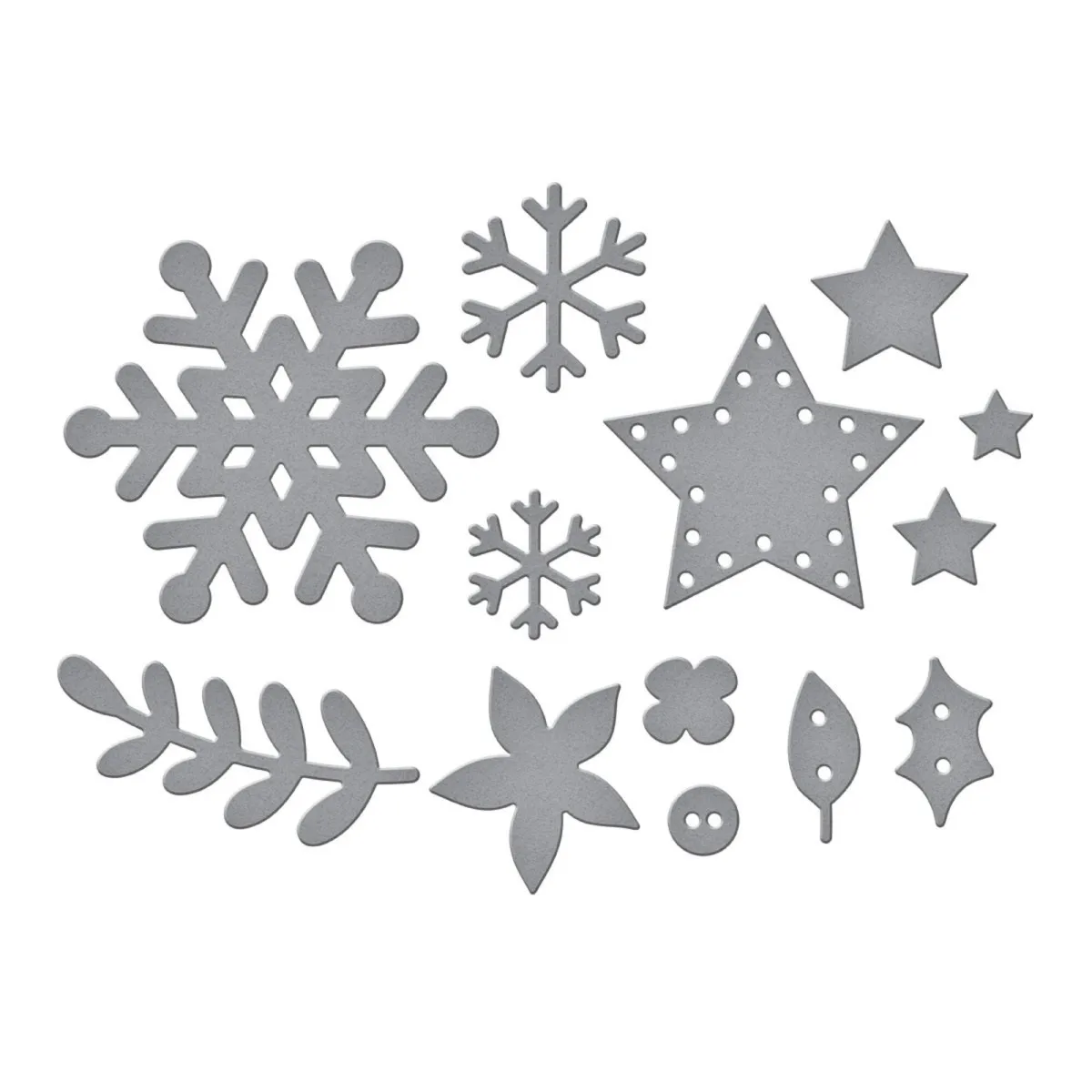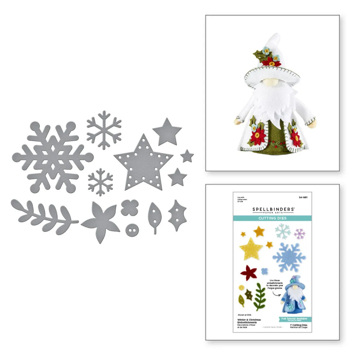 Die „Winter & Christmas Embellishment Etched Dies“ stammen aus der 3D Felt Décor Collection von Sandi MacIver. Verwende dieses Set aus sieben dünnen Metallstanzformen als Akzente auf deinen Projekten, gruppiere sie zu einem Arrangement oder nutze sie, um S7-278 Fergus zu verzieren. Es ist ein wunderschönes Set, um die Winter- und Weihnachtszeit zu feiern! Um deinen Projekten noch mehr Charme zu verleihen, kannst du kleine süße Knöpfe aus unserer Embellishment-Abteilung hinzufügen.