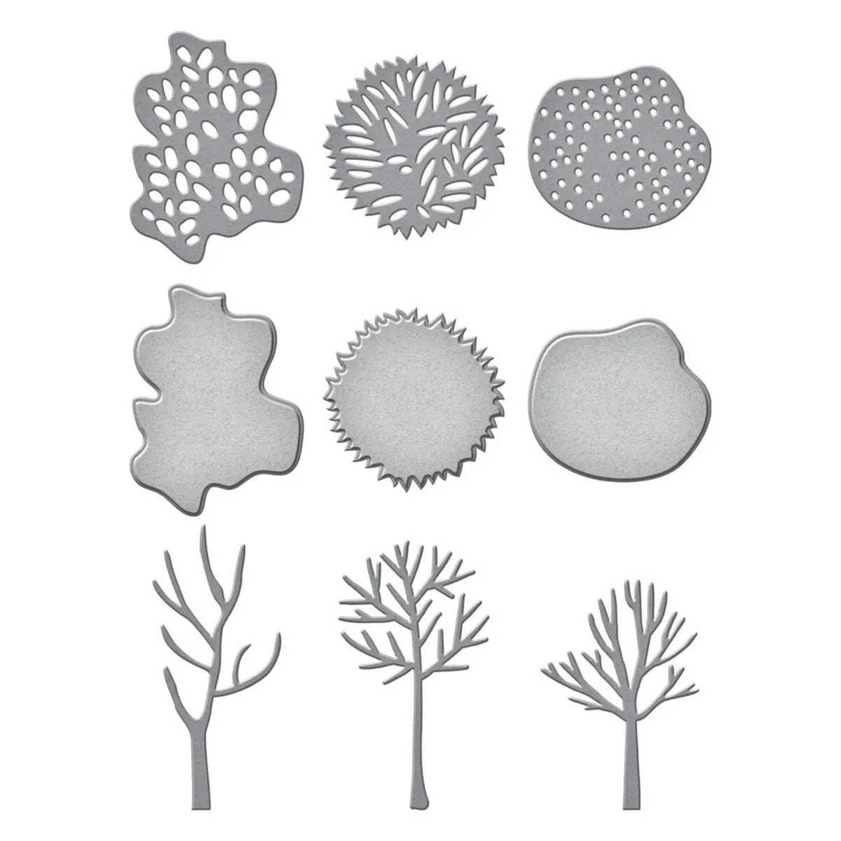 Die Changing Trees Etched Dies gehören zur Autumn Archives Collection von Kelly Bangs. Mit dem Set aus neun dünnen Metallschneideformen lassen sich drei verschiedene Baumdesigns in unterschiedlichen Größen gestalten. Du kannst die Bäume individuell einfärben oder viele ausschneiden, um einen ganzen Wald zu kreieren – richtig viel Spaß!