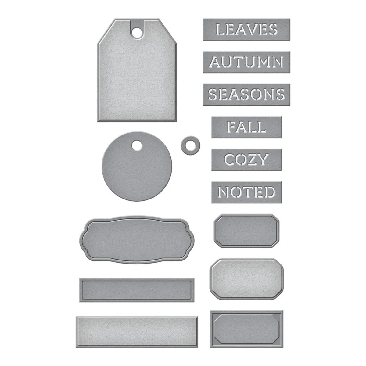 Die Documenting Labels Etched Dies gehören zur Autumn Archives Collection von Kelly Bangs. Dieses Set aus 17 dünnen Metallschneideformen ermöglicht dir verschiedene Arten von Etiketten- und Anhängerformen, um einen Spruch einzurahmen oder einen wunderbaren Akzent zu setzen. Einige Etiketten haben ihre eigene Einsatz-Stanze, die beim Zusammennutzen die Wörter Fall, Cozy, Noted, Leaves, Autumn und Seasons ausschneidet. Du kannst auch deine eigenen gestalten, indem du deinen Lieblingsspruch aufstempelst.