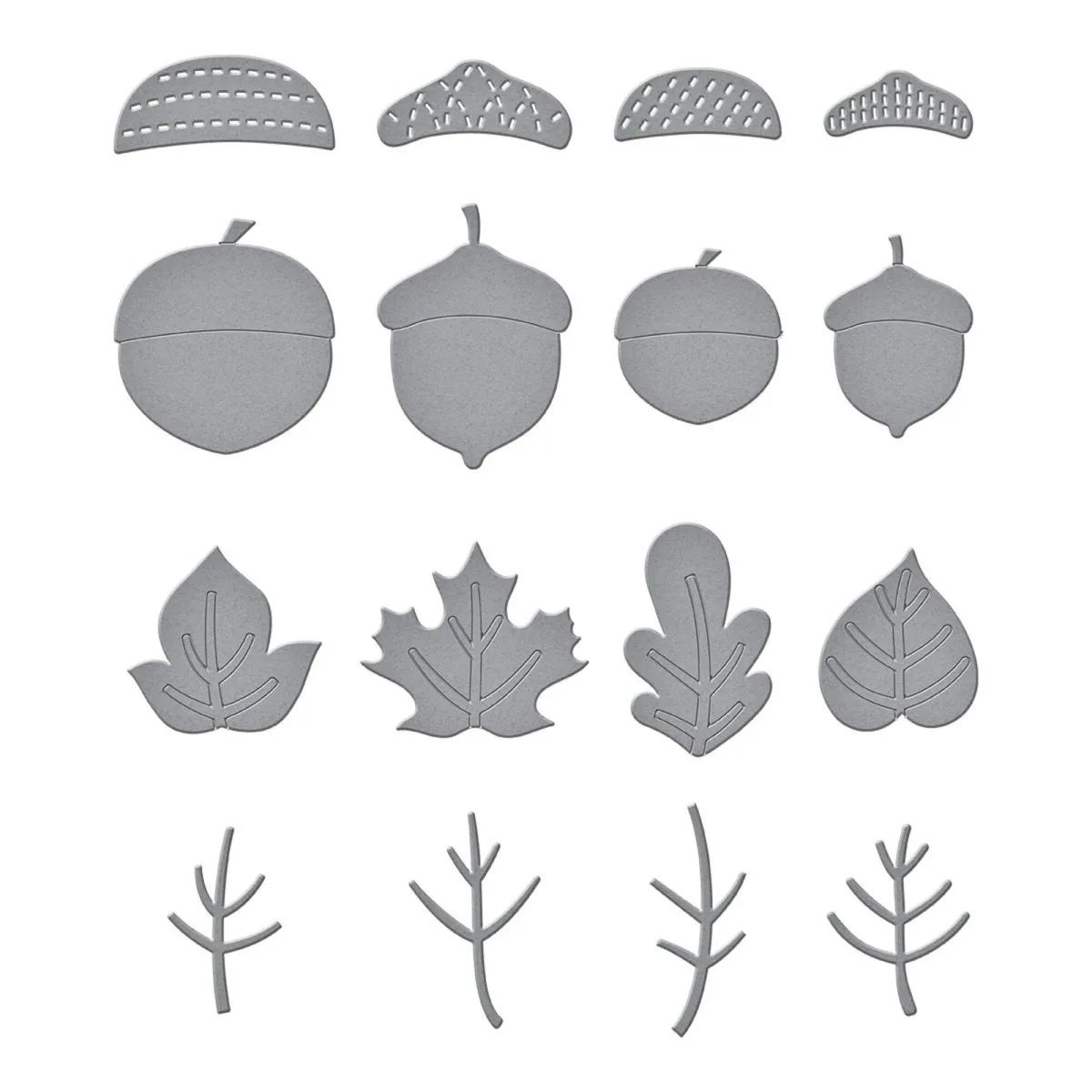 Die Falling Leaves Etched Dies gehören zur Autumn Archives Collection von Kelly Bangs. Was wäre der Herbst ohne Blätter und Eicheln? Mit diesem Set aus 13 dünnen Metallschneideformen kannst du viele davon gestalten! Es gibt vier Designs und Größen für Eicheln und Blätter.