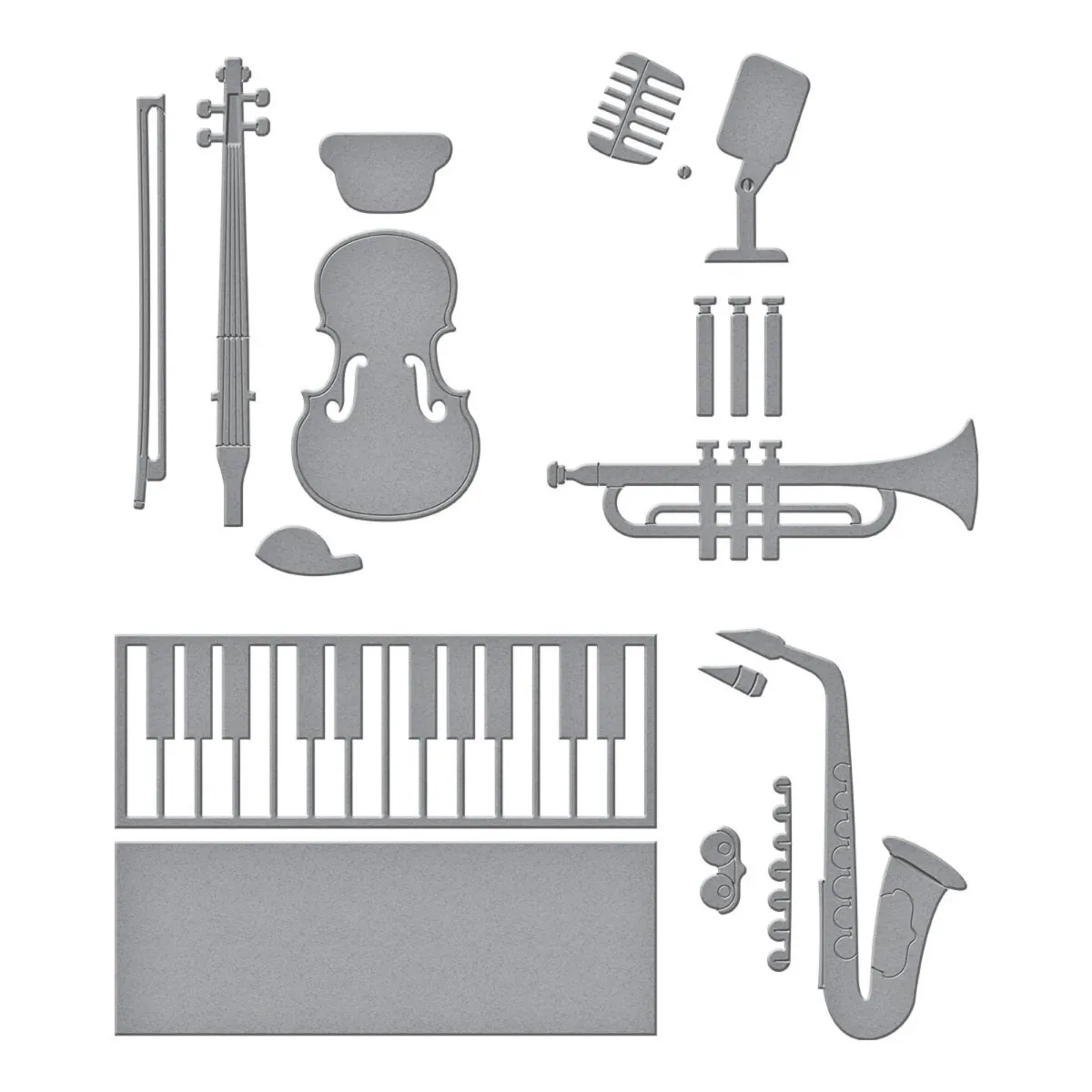 Die Mini Musical Instruments Etched Dies sind Teil der Bibi's Musical Notes Collection von Bibi Cameron. Erstelle ein musikalisches Ensemble mit diesem Set aus 13 dünnen Metall-Stanzformen! Es enthält alles von Hörnern, Saiteninstrumenten, Tasteninstrumenten bis hin zu einem Mikrofon. Man kann die Musik schon fast hören!