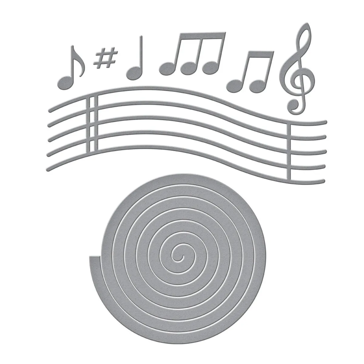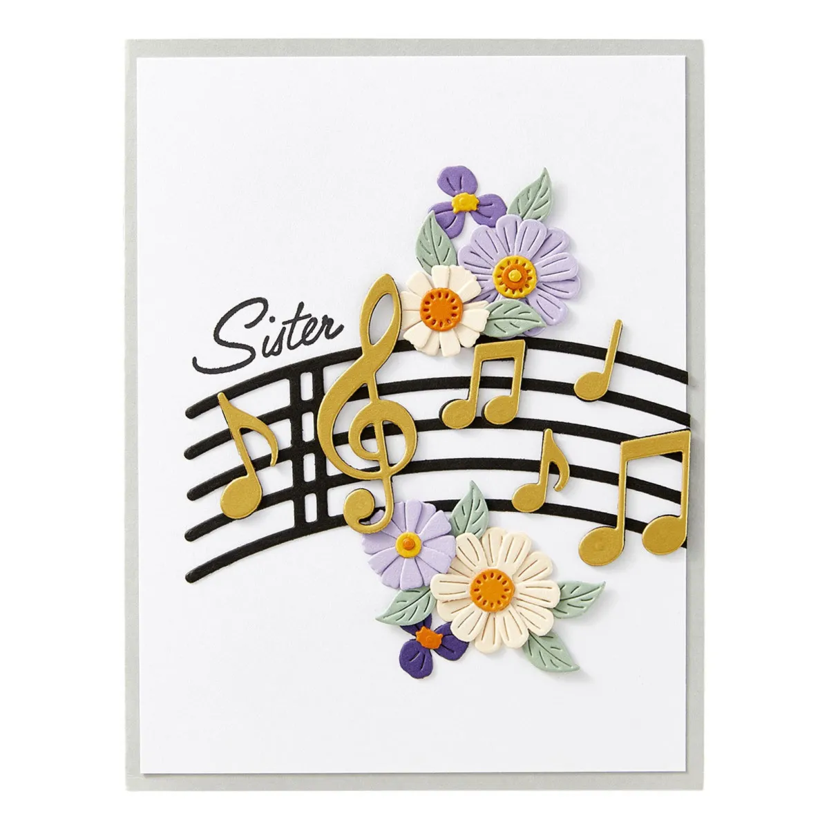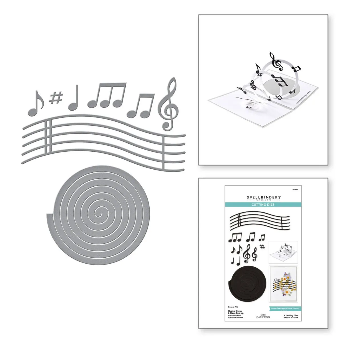 Die Musical Notes & Stave Pop-Up Etched Dies stammen aus der Bibi's Musical Notes Collection von Bibi Cameron. Dieses vielseitige Set aus acht dünnen Metall-Stanzformen erstellt Notenlinien voller musikalischer Notation und eine Spiral-Pop-Up-Funktion. Mit diesen Stanzformen erwacht die Musik förmlich zum Leben!