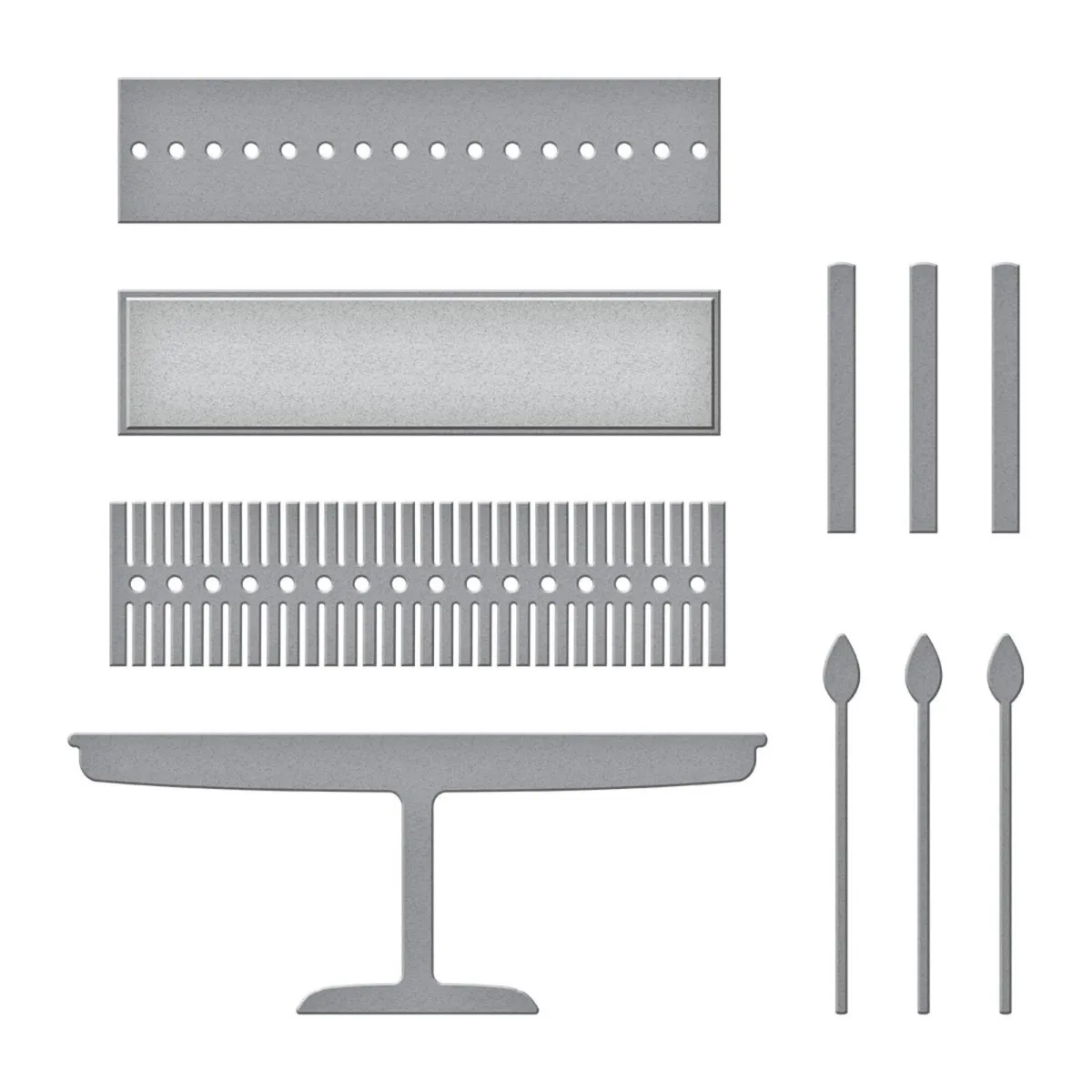 Stitched Fringe Cake Etched Dies ist Teil der Birthday Celebrations Collection. Mit diesem Set aus sechs dünnen Metallstanzen kannst du eine wunderschöne, moderne Torte zusammenstellen. Verwende die Fransenlage, um Bewegung zu erzeugen, kombiniere sie mit dem gestickten Design für zusätzliche Details ... es gibt so viele Gestaltungsmöglichkeiten. Im Set enthalten sind auch die Tortenplatte, die Kerze und ihre Flammen.