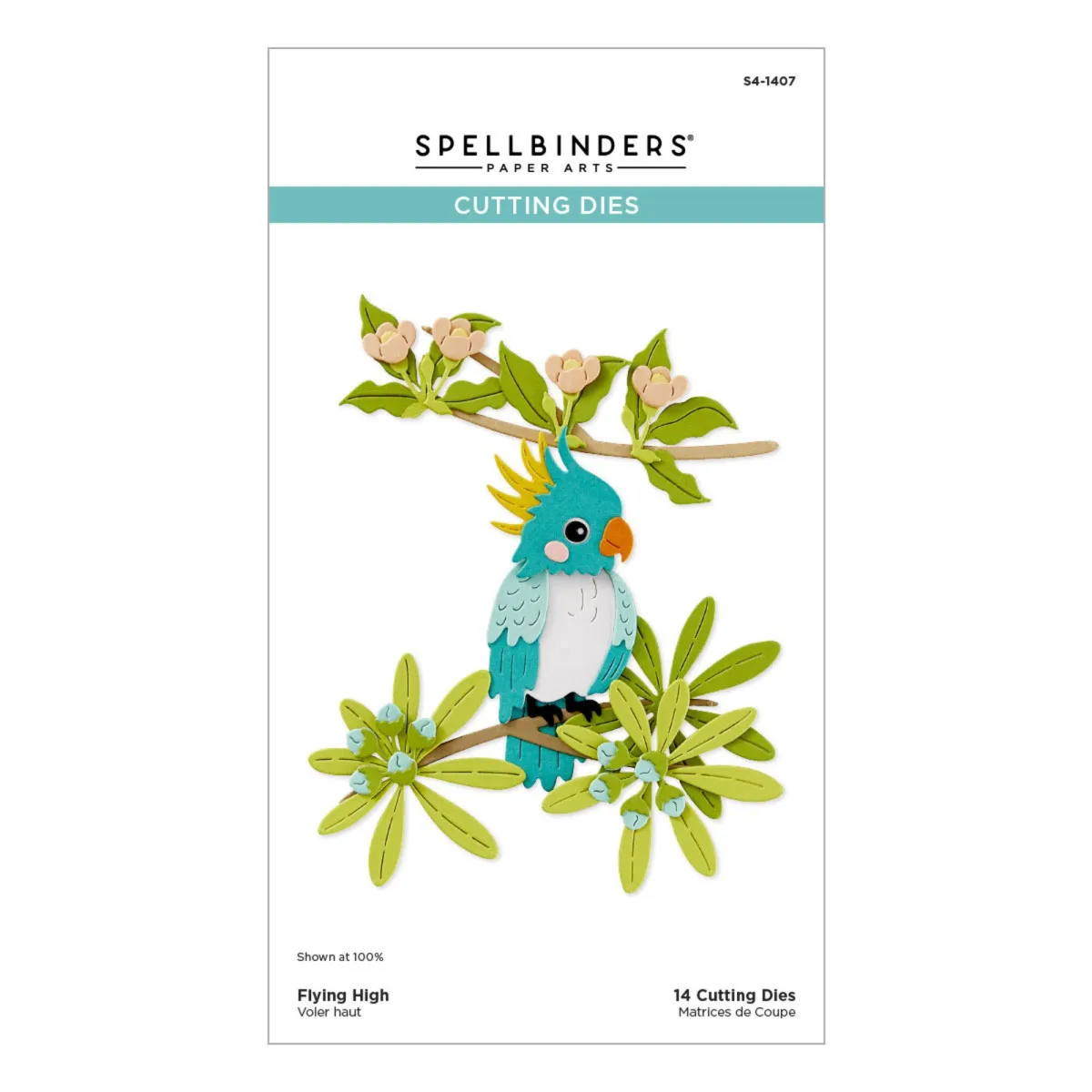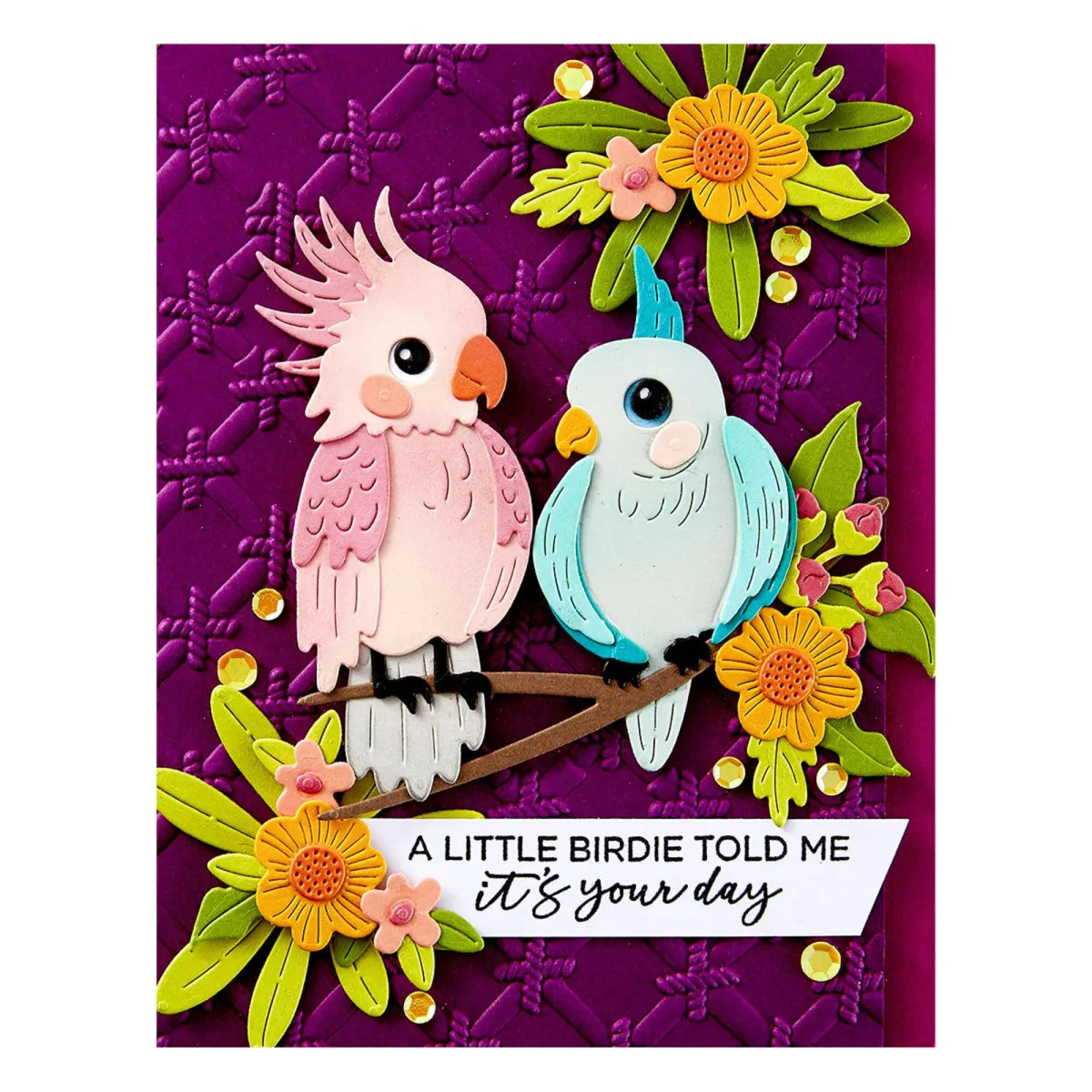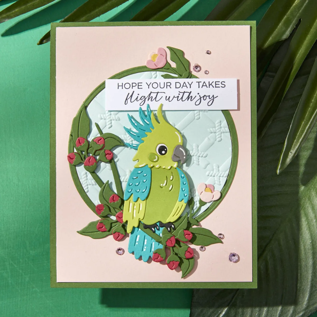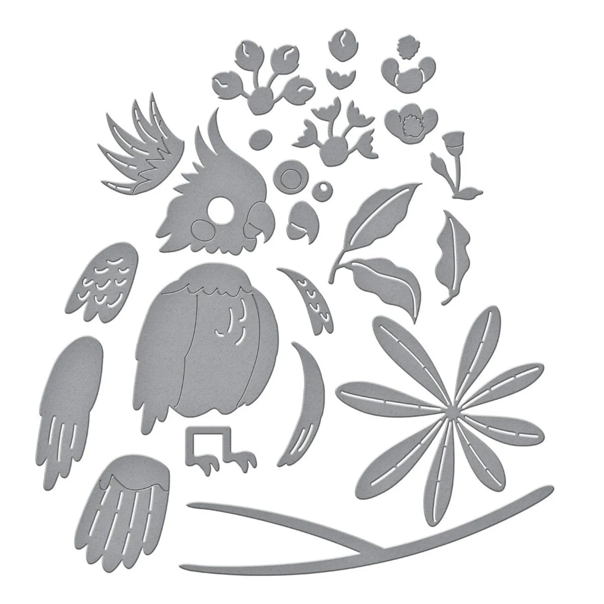 Flying High Etched Dies sind Teil der Cheerful Chirps Collection. Mit diesem Set aus 14 filigranen Stanzschablonen kannst du einen süßen Kakadu gestalten, der auf einem Ast sitzt – dazu gibt es viele tropische Blumen, mit denen du das Motiv wunderbar verzieren kannst.
