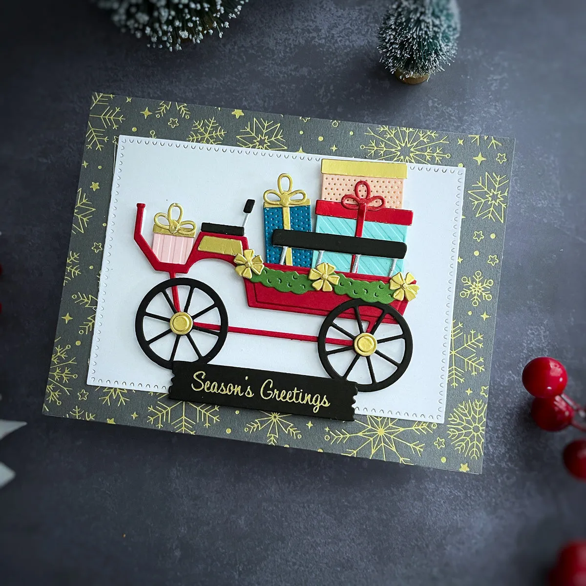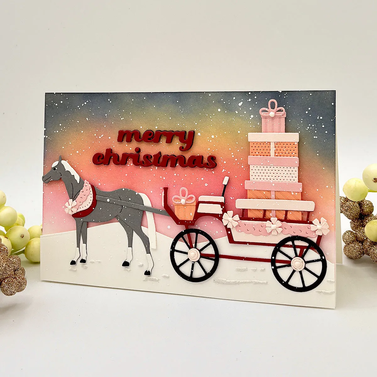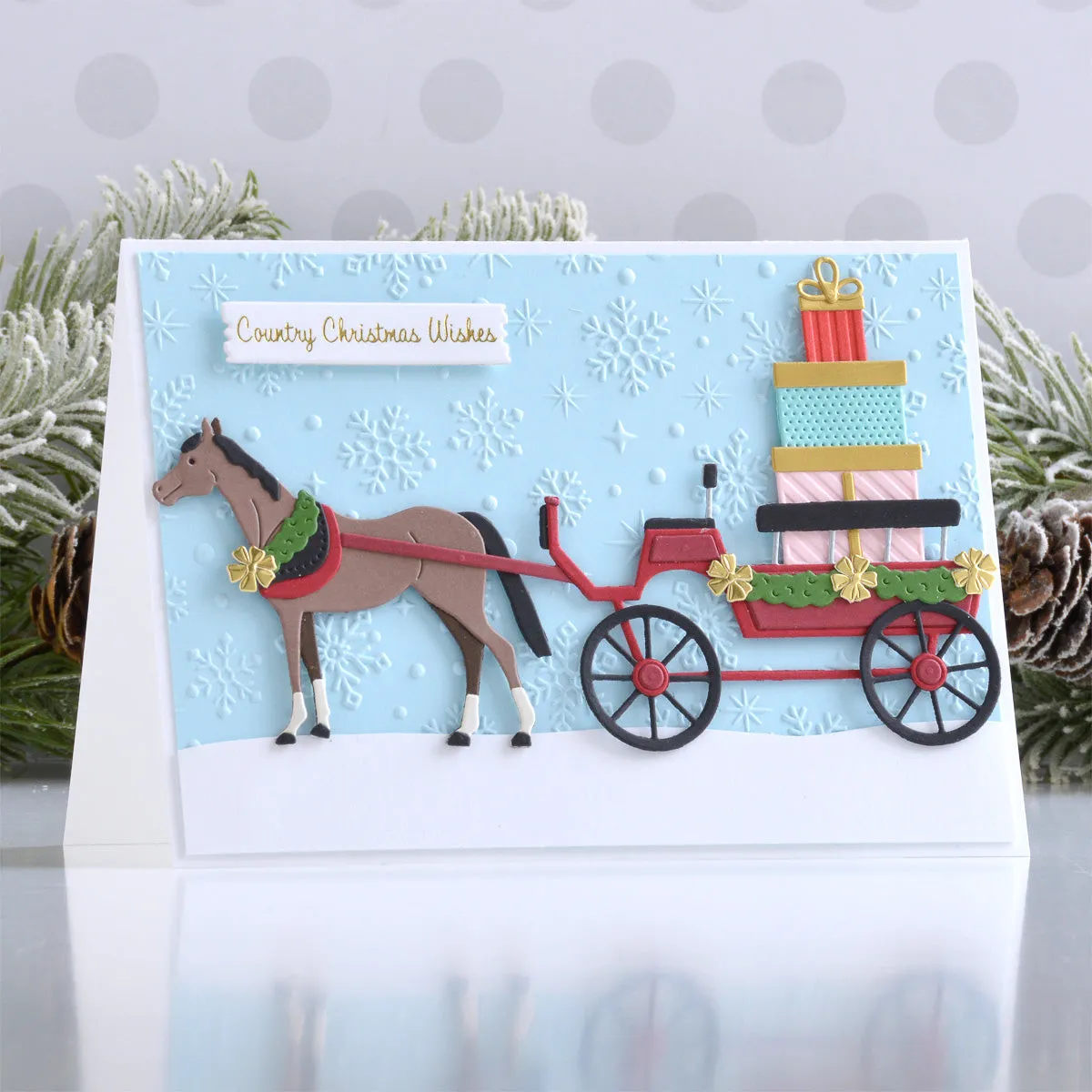 Die „Christmas Horse-Drawn Wagon“ Stanzschablonen sind Teil der Country Christmas Kollektion von Annie Williams. Weihnachten ohne einen pferdegezogenen Wagen voller Geschenke? Undenkbar! Dieses Set aus 22 dünnen Metallstanzschablonen hilft dir, genau so einen Wagen für dein Projekt zusammenzustellen. Alle Details sind enthalten – von Geschenken, Schleifen bis hin zu einem festlichen Halskranz für das Pferd! Du kannst das Set auch schlicht lassen, um es das ganze Jahr über zu nutzen. Elemente eines ländlichen Weihnachtsstils sind in dieser Country Christmas Kollektion von Annie Williams liebevoll zusammengestellt. Verleihe deinen kommenden Weihnachtsprojekten eine gemütlich-rustikale Atmosphäre!