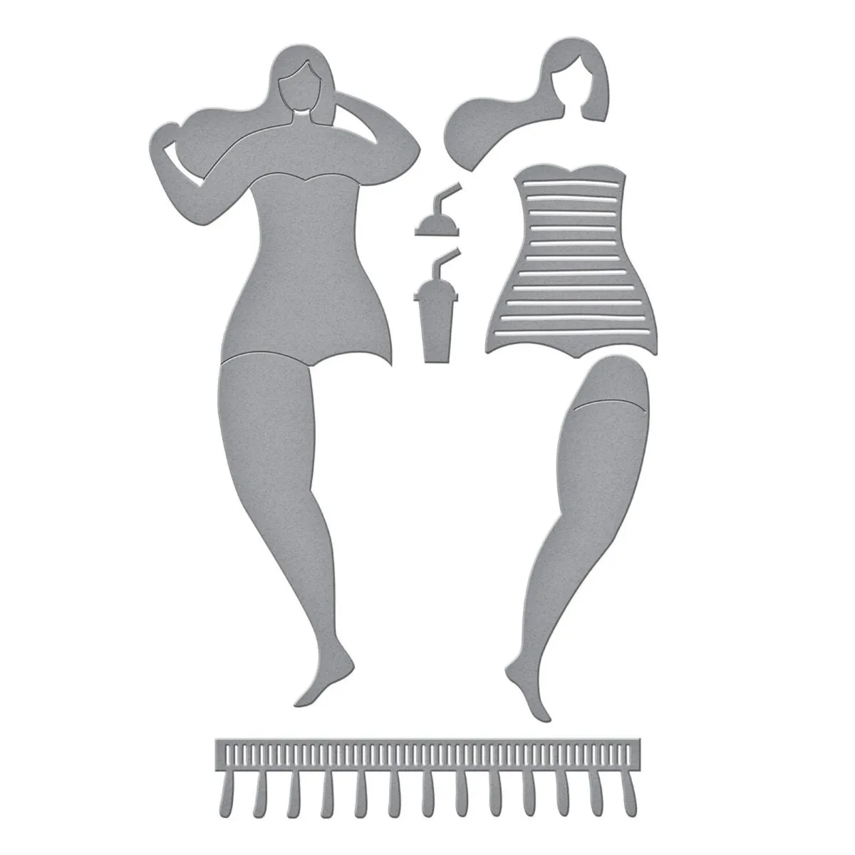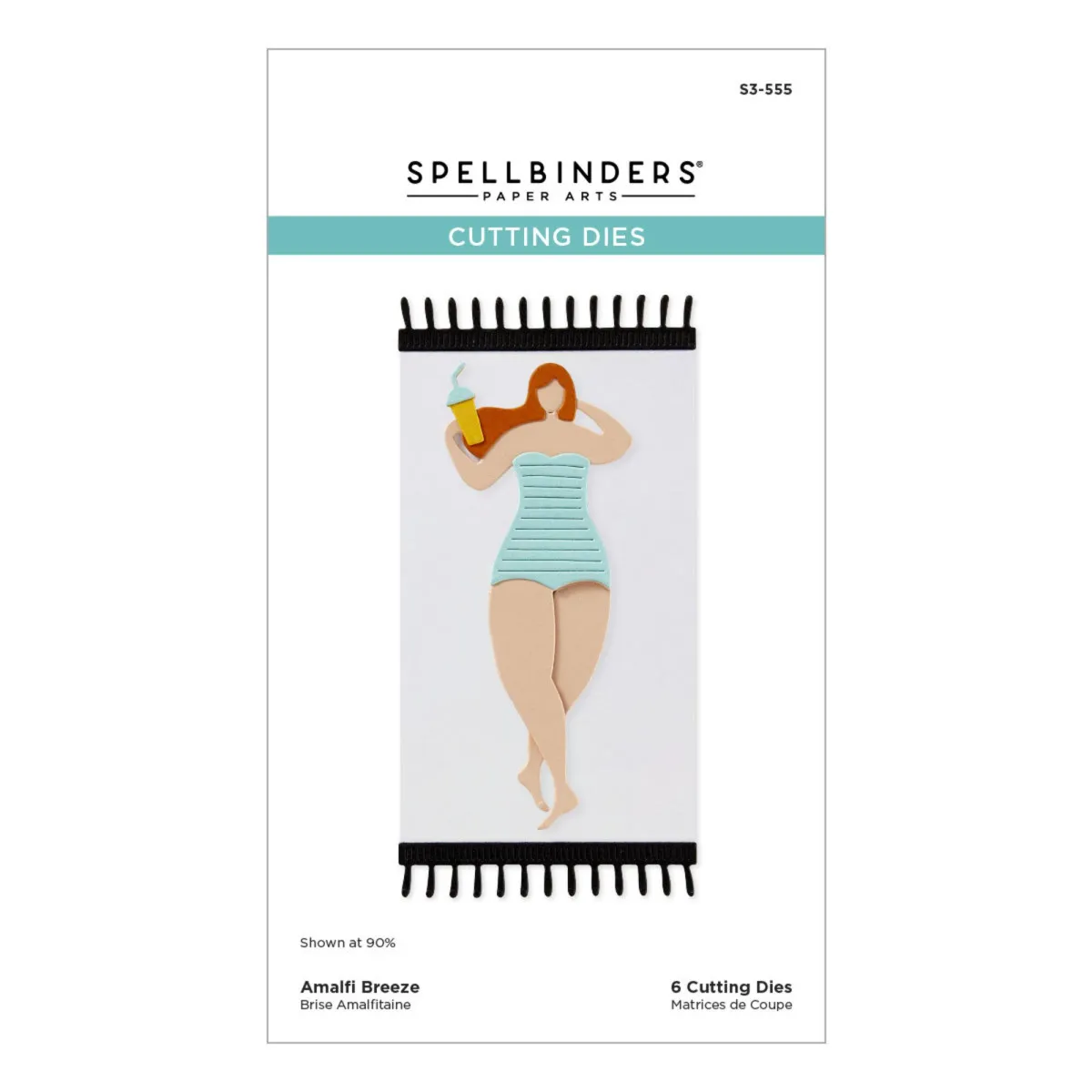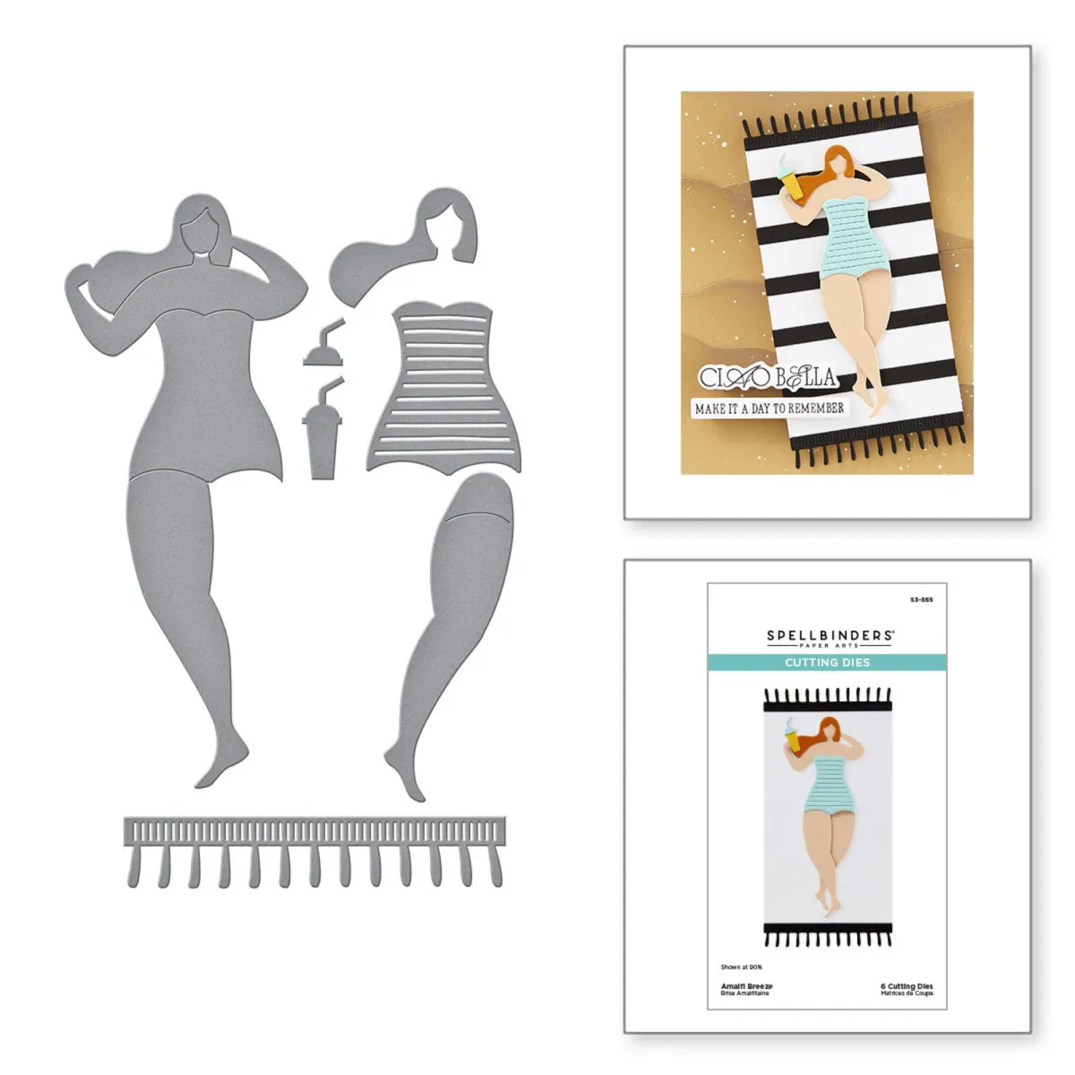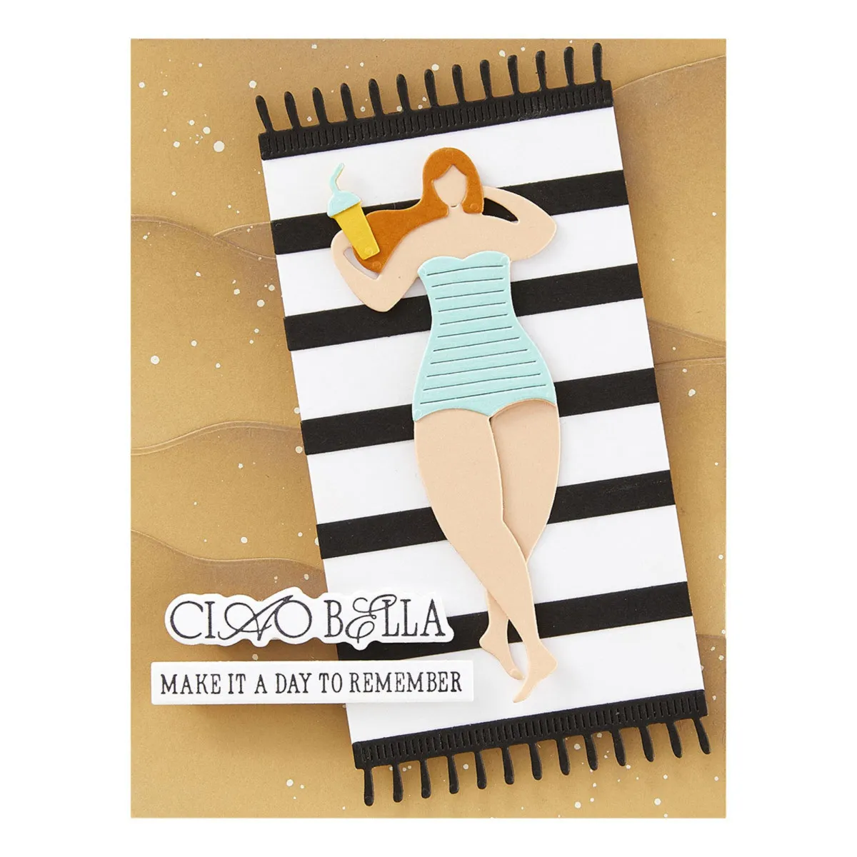 Die „Amalfi Breeze“ geätzten Stanzformen sind Teil der La Dolce Vita Kollektion. Dieses Set aus sechs dünnen Metallstanzformen bildet zusammen eine sonnenbadende Schönheit mit ihrem Handtuch – und sie hat sogar ein kühles Getränk, um sich abzukühlen!