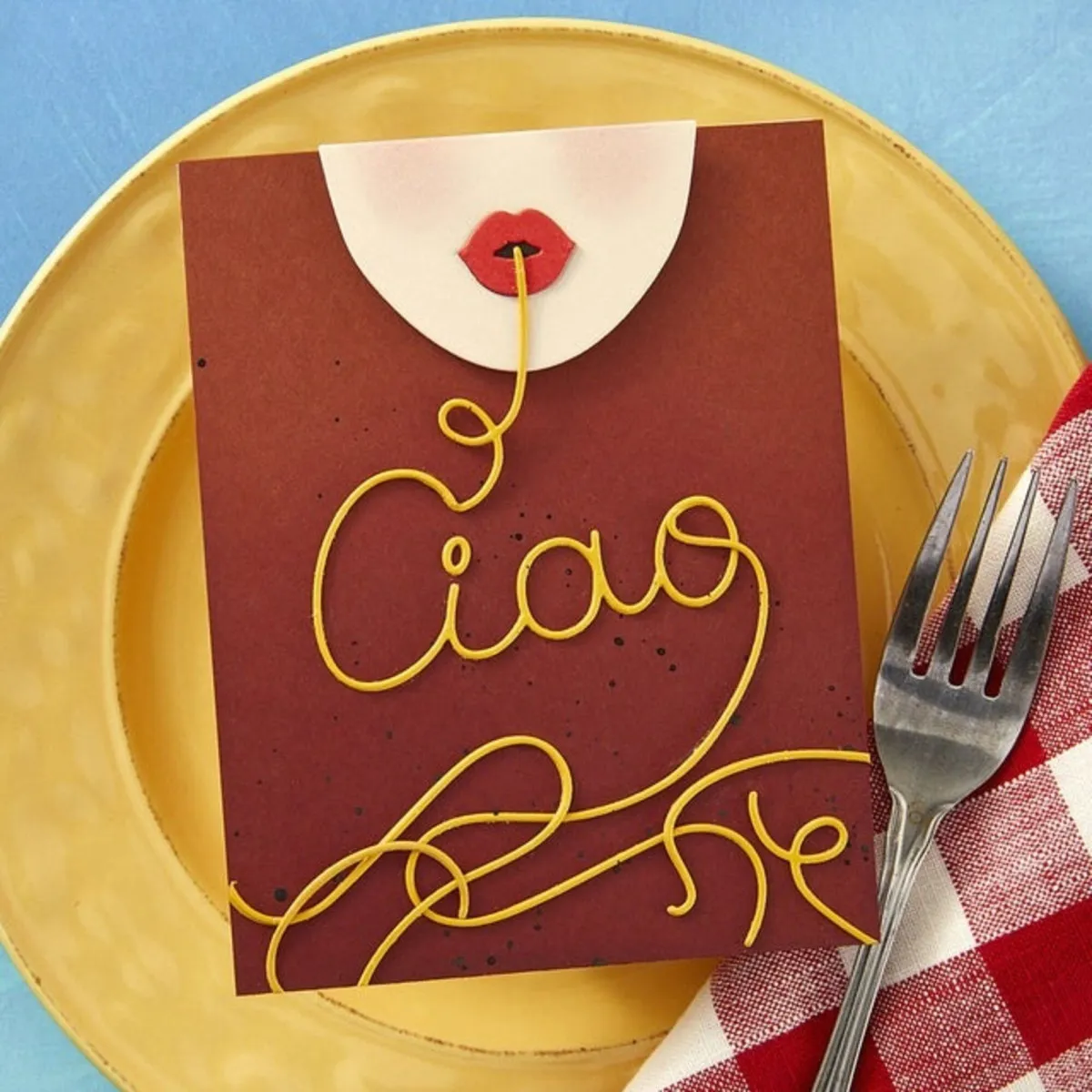 Die „Ciao Spaghetti“ Stanzschablonen gehören zur La Dolce Vita Kollektion. Dieses witzige Set aus sechs filigranen Metallschablonen formt den Schriftzug „Ciao“ aus einem Spaghettifaden – kurz bevor er aufgesogen wird! Schneide mehrere Spaghettis aus, um eine ganze Schüssel zu füllen. Perfekt für die kleine Feinschmeckerin oder den kleinen Feinschmecker in dir!