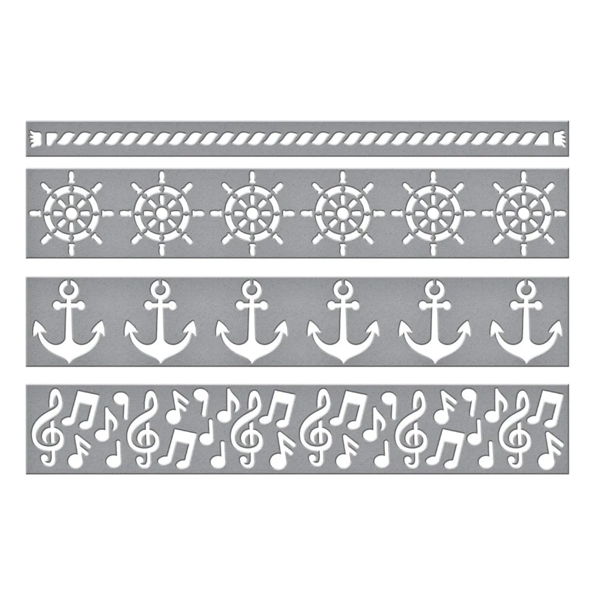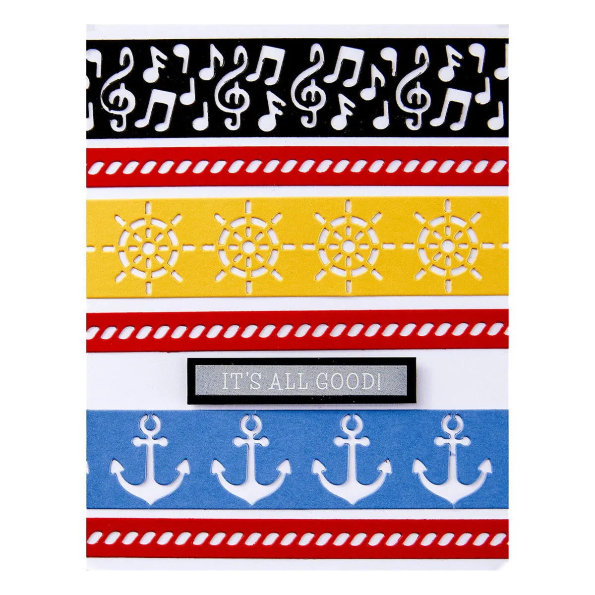 Die „Classic Mouse Borders“ geätzten Stanzformen stammen aus der Say Cheese Classic Mouse Kollektion und verleihen all deinen Scrapbook-Seiten und Karten den perfekten letzten Schliff. Dieses Set mit vier Bordüren greift Steamboat Willies nautische Ursprünge auf und enthält Bordüren mit einem Anker, Seil und Steuerrad sowie eine mit Musiknoten, zu der du fröhlich mitsummen kannst. Durch ihre sich wiederholenden Muster können diese Bordüren mehrfach ausgestanzt werden, um sie auf jede gewünschte Länge zu verlängern. Verwende eine einzelne Bordüre auf einer Scrapbook-Seite als verbindendes Element oder probiere alle vier zusammen für eine unvergessliche Karte aus.