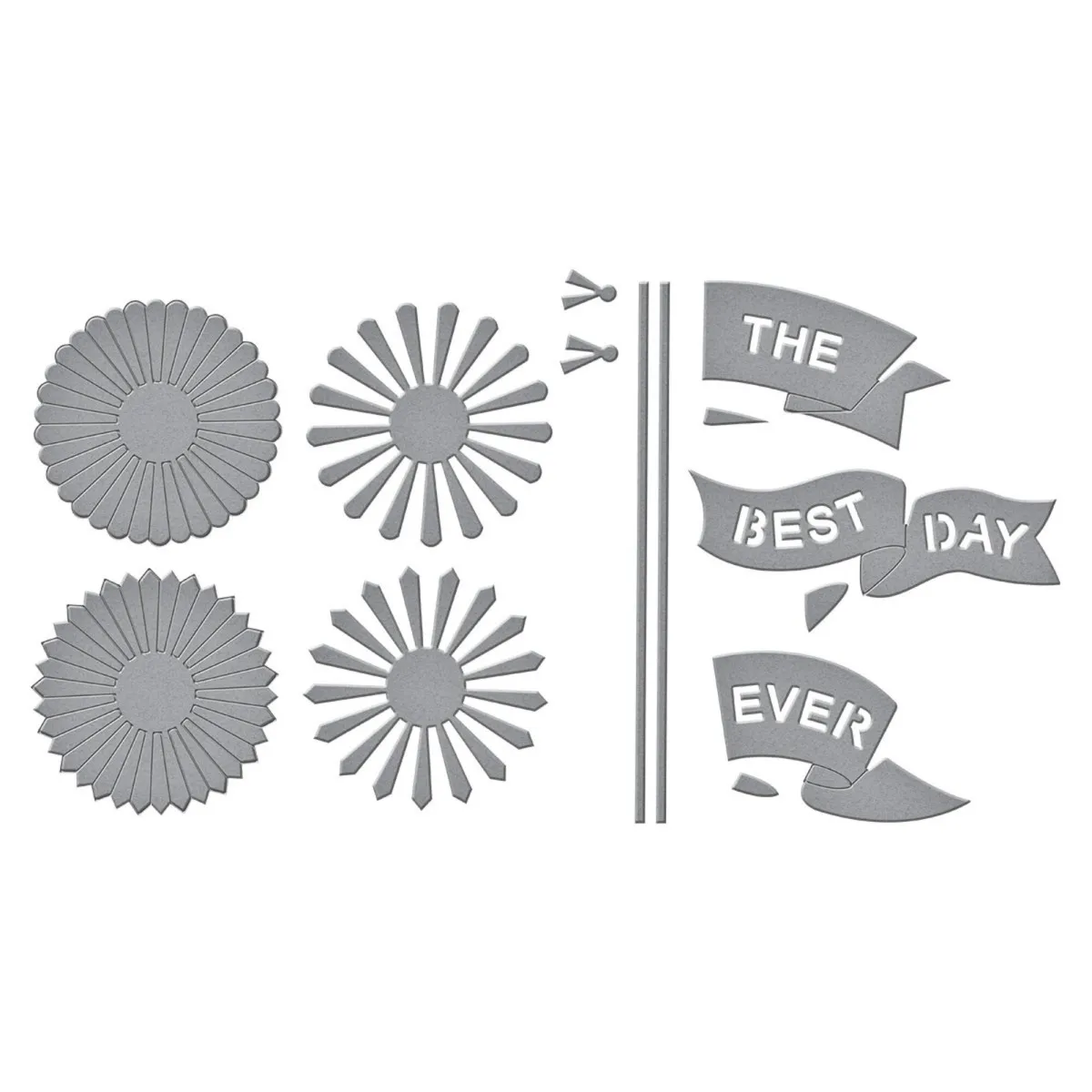Die „Classic Mouse Flags & Banners“ geätzten Stanzformen stammen aus der Say Cheese Classic Mouse Kollektion und enthalten 13 Stanzformen, mit denen du wunderschöne, mehrlagige Rosetten und geschwungene Banner gestalten kannst, auf denen „The Best Day Ever“ steht. Die Rosetten sind so gestaltet, dass sie perfekt zu den Buchstaben und Zahlen aus den Sets S5-703 Alphabet und S4-1469 Zahlen & Satzzeichen passen, damit du reichhaltig geschichtete Titel für deine Scrapbook-Seiten oder Karten erstellen kannst. Hol dir den klassischen Spaß und den Vintage-Charme mit diesem Set, das sich perfekt mit den anderen Stanzformen der Kollektion oder anderen Elementen aus deinem Vorrat kombinieren lässt!