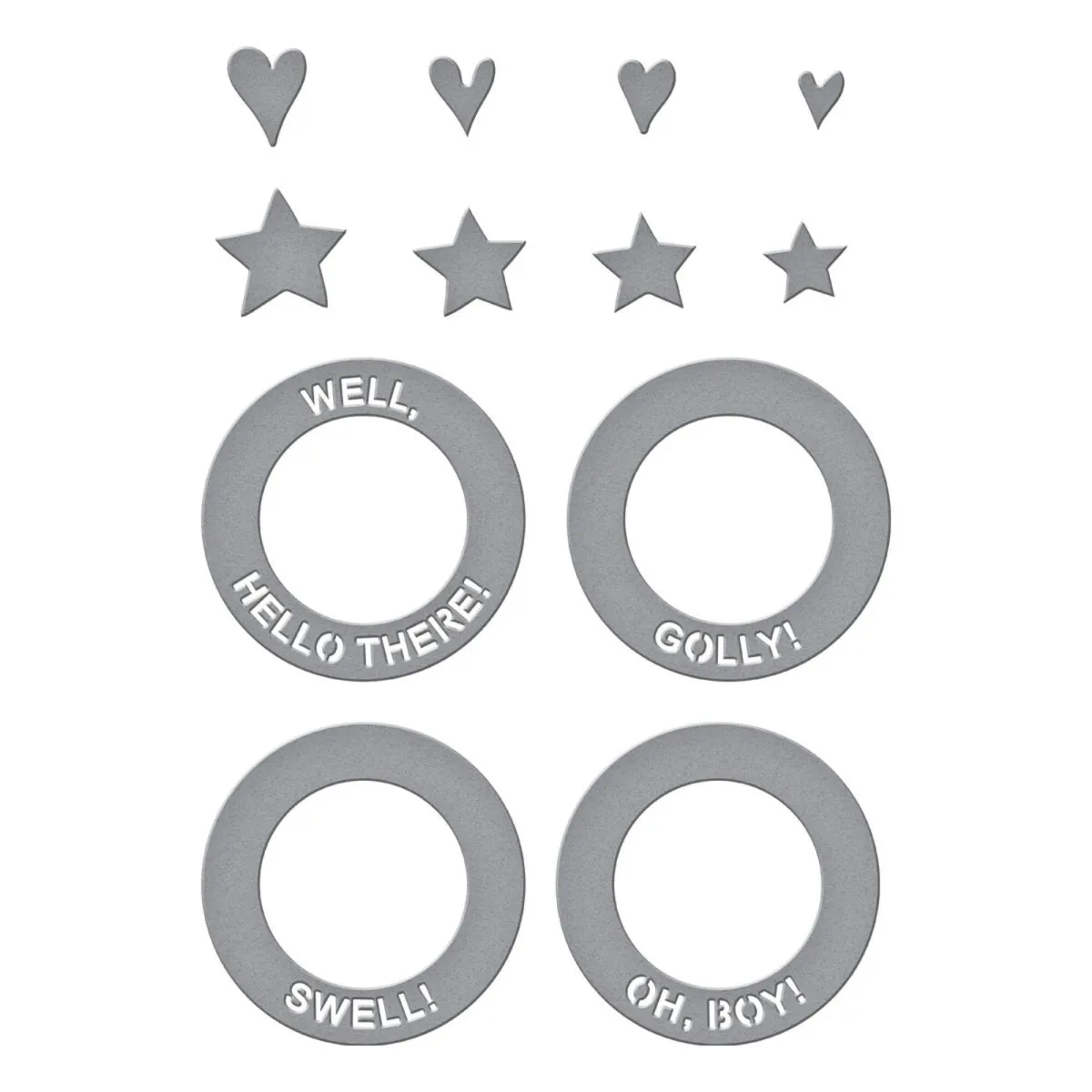 Die „Classic Mouse Frame & Sentiments“ geätzten Stanzformen stammen aus der Say Cheese Classic Mouse Kollektion und werden sicher schnell zu deinen Favoriten gehören. Dieses Set mit 14 dünnen Metallstanzformen erstellt einen runden Rahmen, in den deine Lieblingsmaus perfekt passt. Nachdem du den Rahmen ausgestanzt hast, kannst du aus vier Sprüchen wählen, die genau in den Kreis passen. Du bekommst klassische Ausdrücke wie „Golly“, „Well Hello There!“, „Swell“ und „Oh Boy!“. Außerdem sind Sterne und Herzen enthalten, die die perfekten abschließenden Akzente setzen. Der Rahmen ist so gestaltet, dass er mit dem S5-703 Alphabet, S4-1469 Zahlen & Satzzeichen, S4-1471 Fahnen & Banner und natürlich S6-291 Steamboat Willie Duo kombiniert werden kann. Ein vielseitiges Set, das perfekt in deine Sammlung passt!