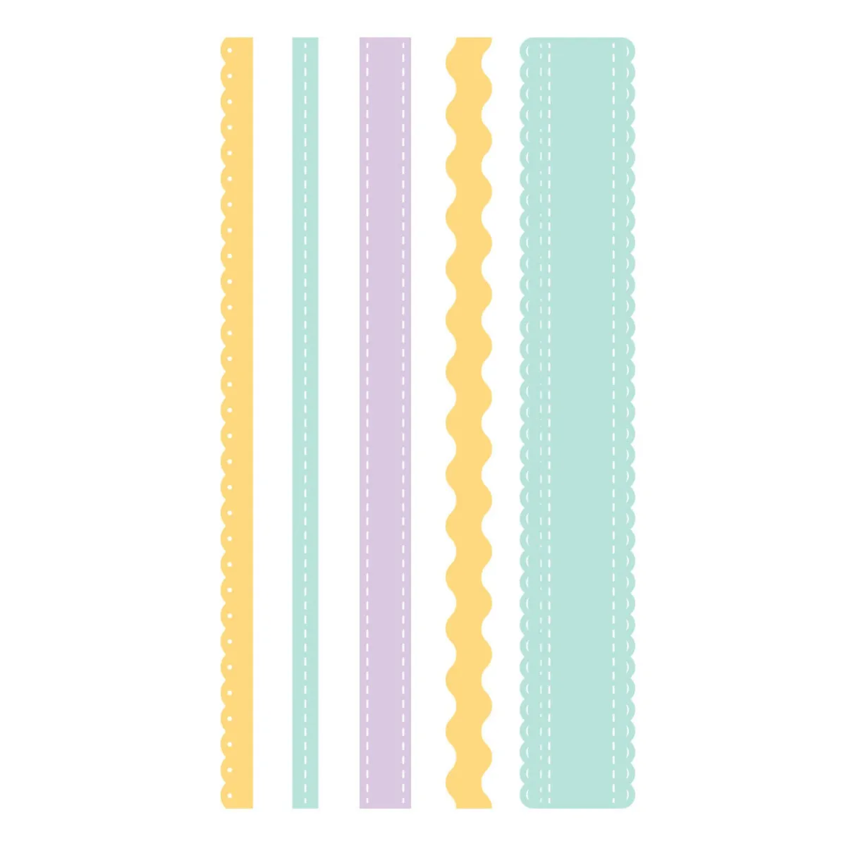 Die Ribbon & Trim Etched Dies sind Teil der Say Cheese Classic Pooh Baby Collection mit Simple Stories. Dieses süße Set schneidet fünf verschiedene dekorative Kantenmuster. Schneide sie zweimal aus, um eine Länge von 12 in./30,5 cm für Scrapbook-Seiten zu erhalten. Schneide sie mehrmals aus, um einen Hintergrund zu gestalten. So viele Designmöglichkeiten mit diesem Set aus fünf dünnen Metall-Stanzformen!