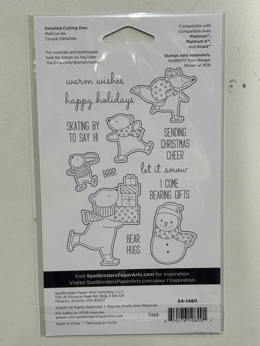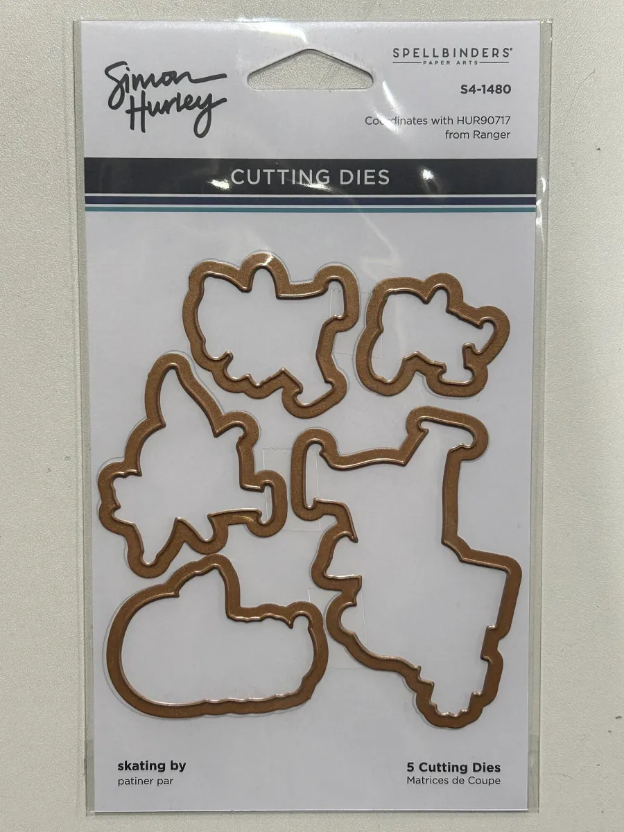 Skating By Etched Dies zur Verwendung mit dem passenden Stempelset wurden von Simon Hurley entworfen und bestehen aus fünf dünnen Metallschneidestanzen. Diese Stanzen sind speziell auf das HUR90717 Skating By Clear Stamp Set abgestimmt, das bezaubernde schlittschuhlaufende Freunde (Fuchs, Hase, Schneemann und zwei Eisbären) sowie acht Sprüche enthält. Stemple die Motive mit all ihren Details, dann stanze sie aus und hebe sie hervor, um zusätzliche Struktur und Dimension zu erzeugen. Ein superniedliches Set!