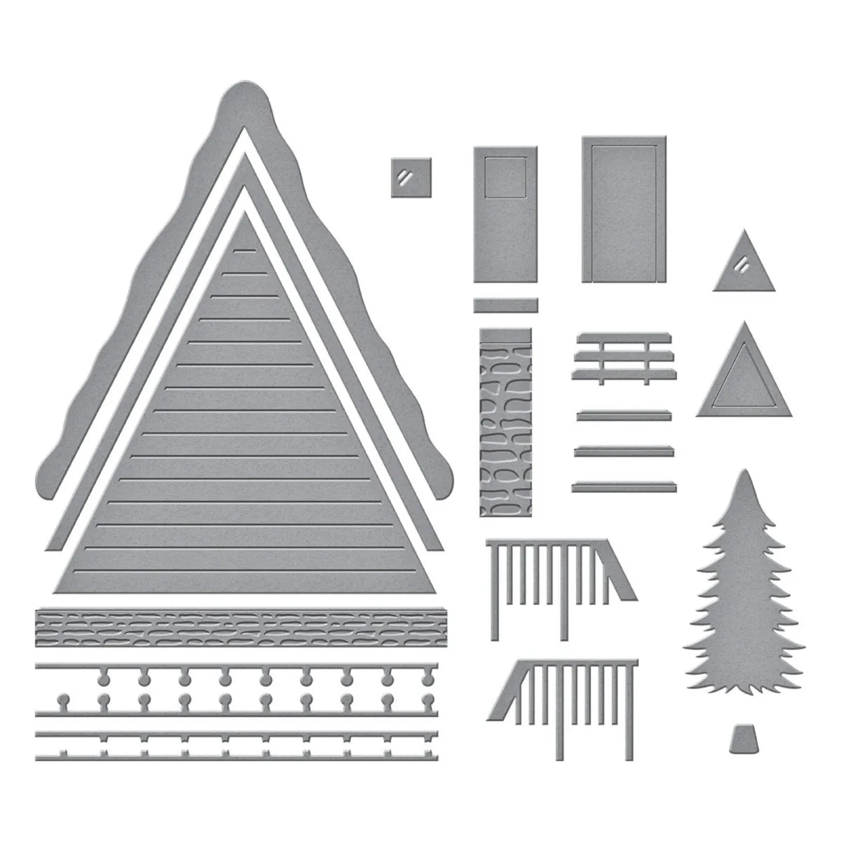 Die Ski Lodge Etched Dies sind Teil der Ski-son's Greetings Collection von Simon Hurley. Baue eine fabelhafte alpine Skihütte mit diesem Set aus 17 dünnen Metall-Stanzformen! Kein Detail bleibt unberücksichtigt: die Ziegeldetails sorgen für die perfekte Struktur, das schneebedeckte Dach vermittelt ein winterliches Gefühl, und Lichterketten verleihen Charme und Glanz. Ergänze einfach die Freunde aus den S3-563 Hit the Slopes Dies!