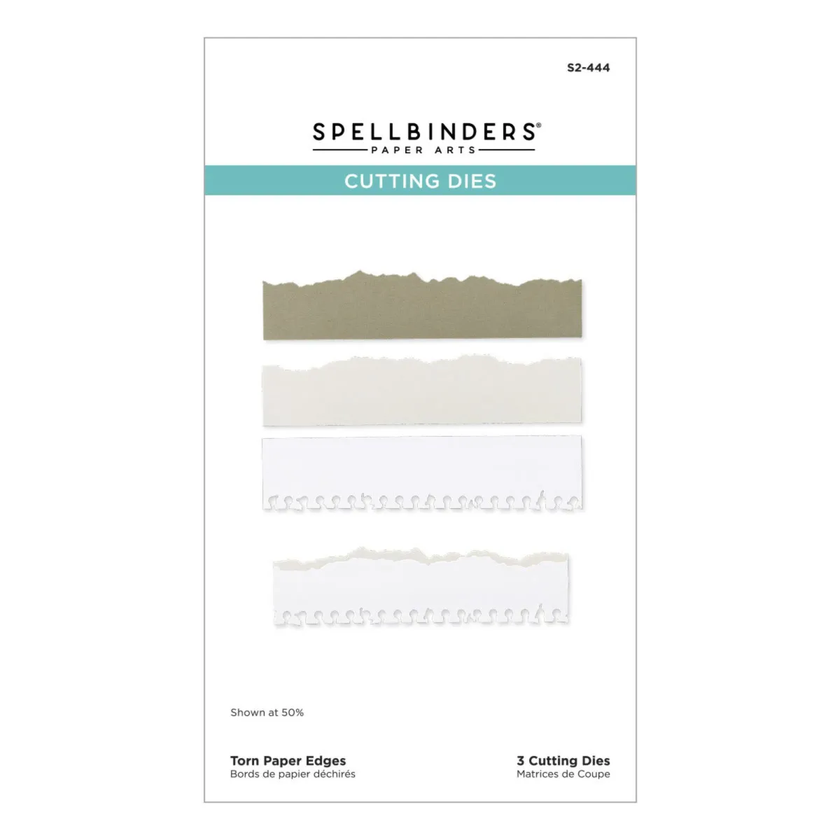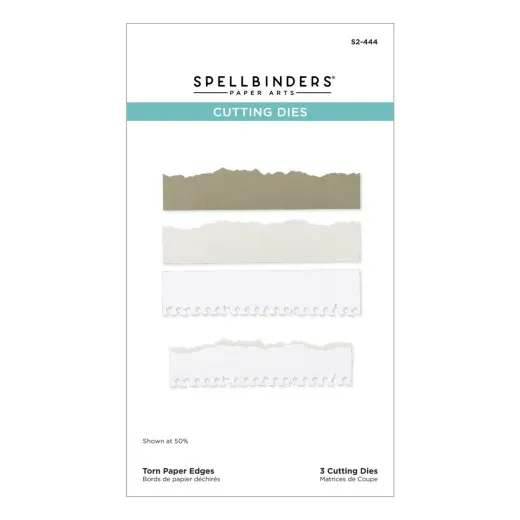 Die Torn Paper Edges Etched Dies sind Teil der Take Note Kollektion und enthalten drei dünne Metall-Stanzteile. Zwei Stanzteile erzeugen unterschiedliche eingerissene Kanten, das dritte schneidet eine eingerissene Spiralblockkante aus.