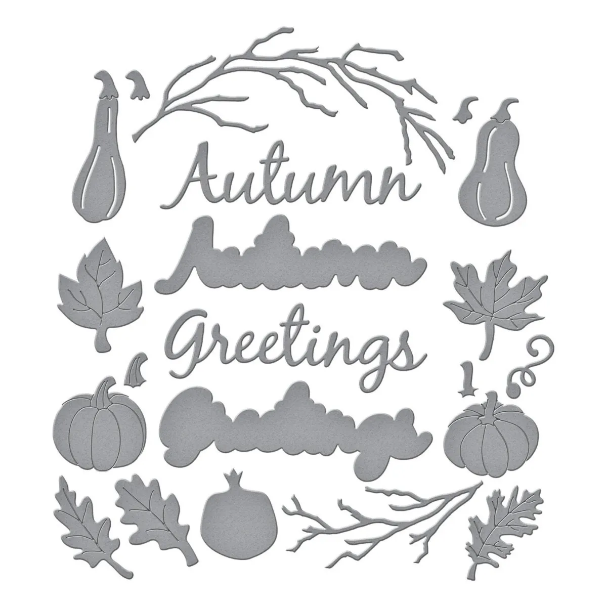 Die Autumn Greetings Wreath Etched Dies stammen aus der Texture & Foliage Collection von Suzanne Hue. Das Set aus 13 dünnen Metallschneidformen erstellt einen wunderschönen Kranz aus Weinreben mit vielen Details und dem Schriftzug Autumn Greetings. Damit hast du ein perfektes Highlight für all deine herbstlichen Projekte.
