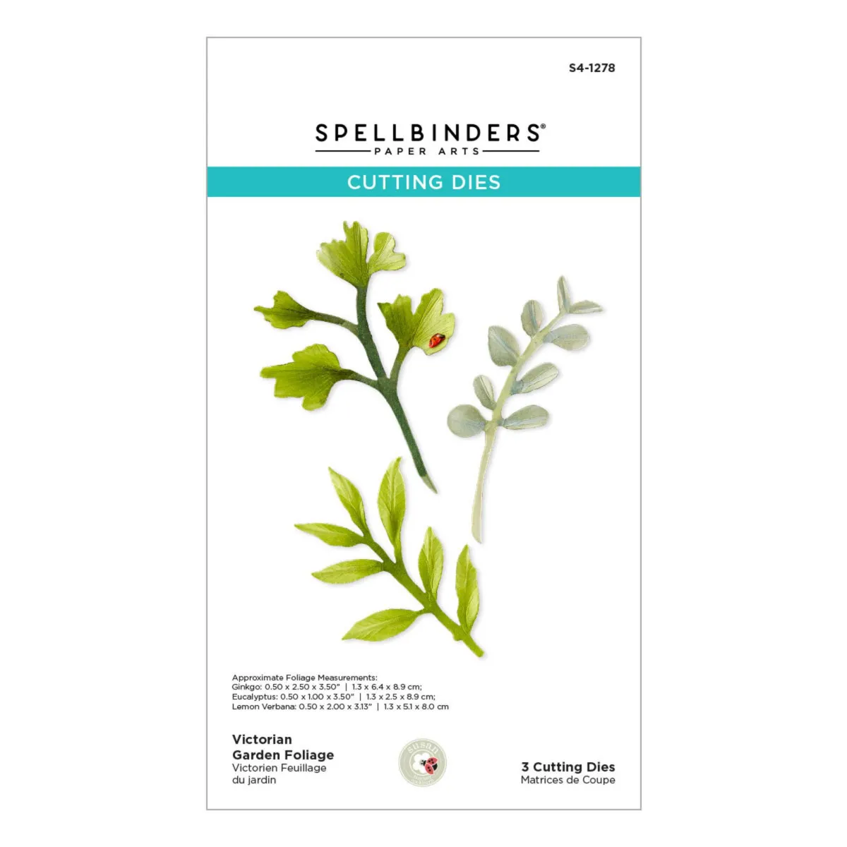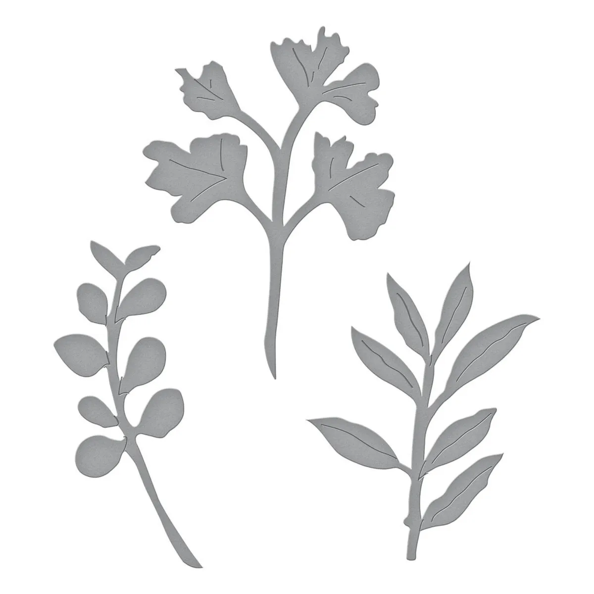 Victorian Garden Foliage – Stanzformen sind Teil der The Victorian Garden Collection von Susan Tierney-Cockburn. Dieses Set besteht aus drei dünnen Metallstanzformen und enthält drei verschiedene Arten von Laub: Ginkgo, Eukalyptus und Zitronenverbene. Stanze ein paar davon aus, um wunderschöne Füllungen für Sträuße und florale Arrangements zu gestalten.