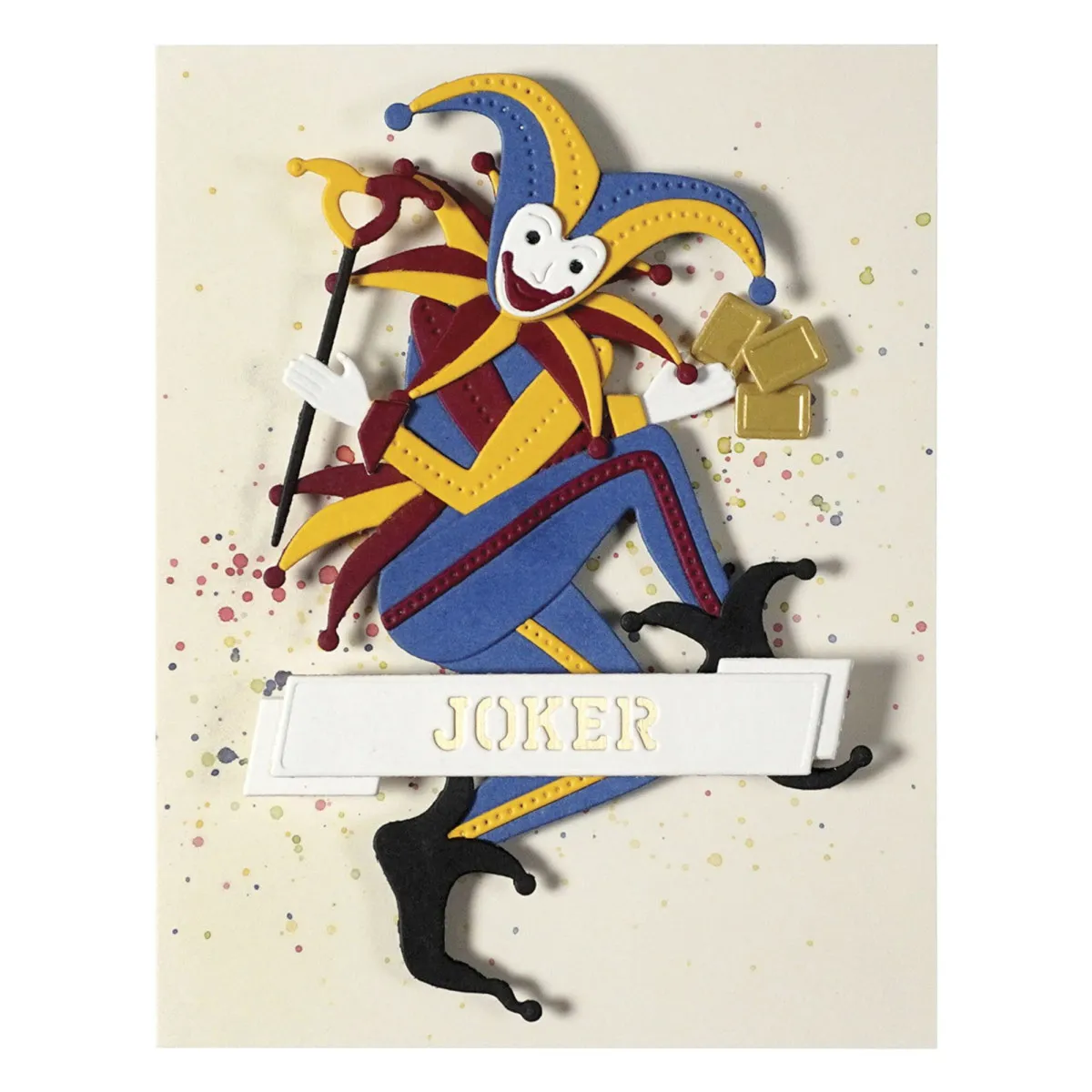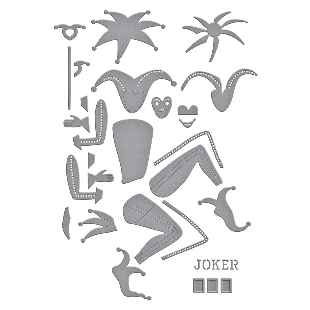 Die Wild Joker Etched Dies gehören zur Jack of All Trades-Kollektion von Jaycee Gaspar. Mit diesem Set aus 21 filigranen Stanzformen aus Metall kannst du ein beeindruckendes und detailreiches Joker-Motiv gestalten. Der Joker ist in voller Länge und in einer Tanzpose dargestellt – passend für eine Standard-A2-Kartenfront (10,8 x 14,0 cm).