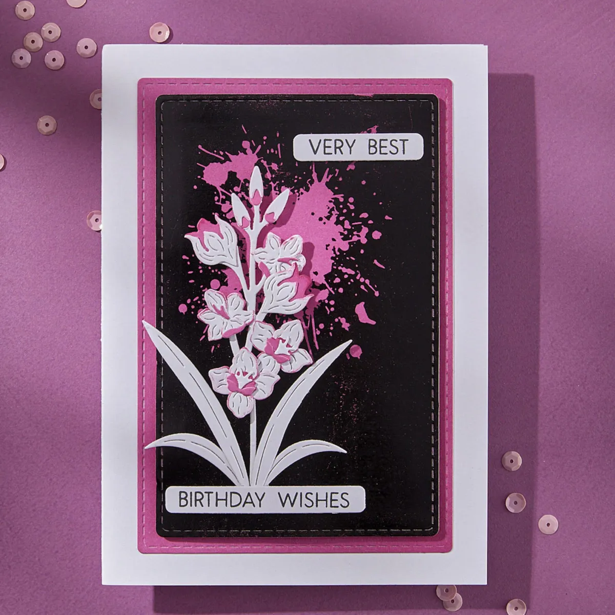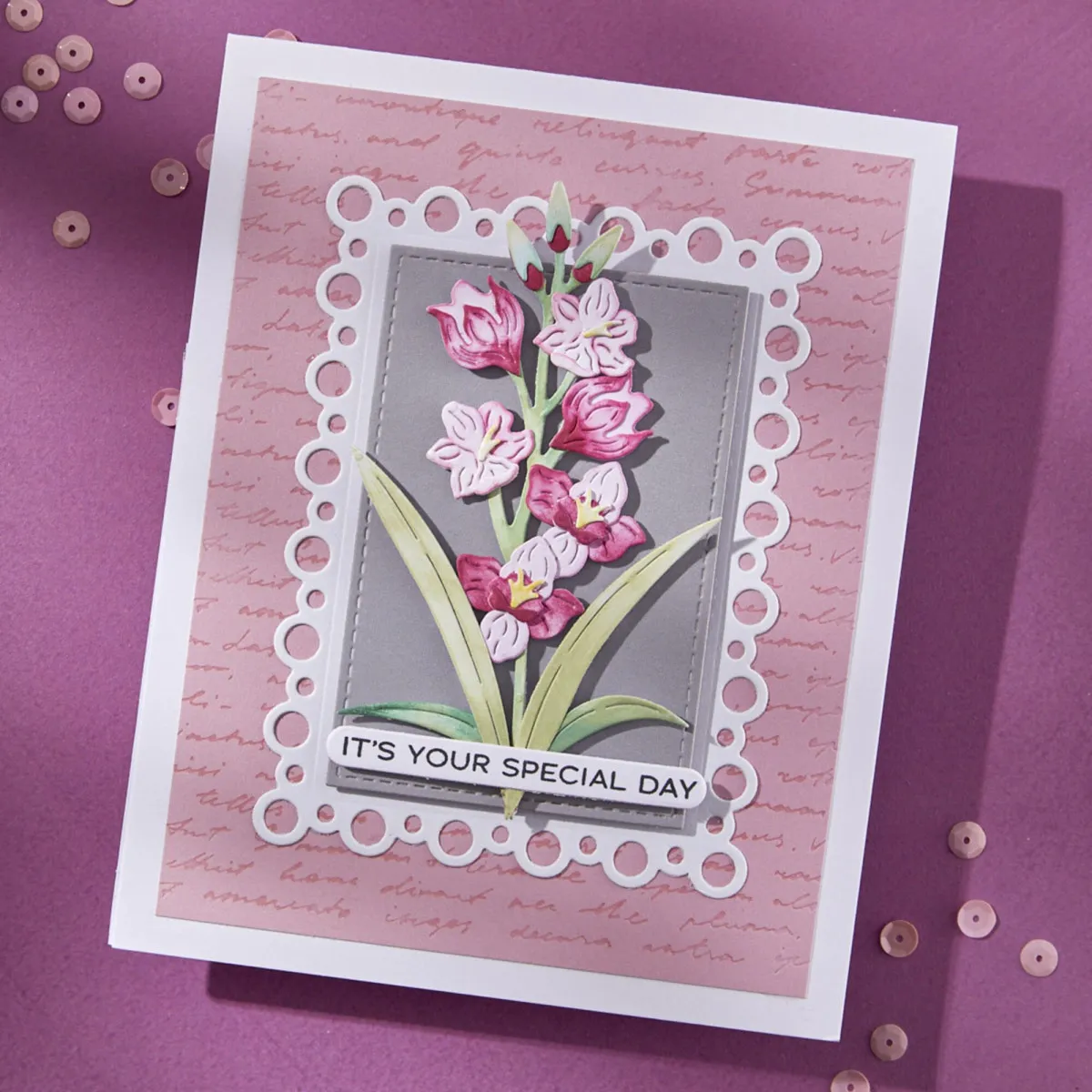 Die Layered Gladiolus Etched Dies sind Teil der Wildflowers Kollektion von Lisa Horton. Zusammengefügt ergibt dieses Set aus 14 dünnen Metall-Stanzformen eine prachtvolle Gladiolenblume mit ihrer typischen trompetenförmigen Blüte und Blättern! Die fertige Gladiolenblume misst ungefähr 7,60 x 11,20 cm.