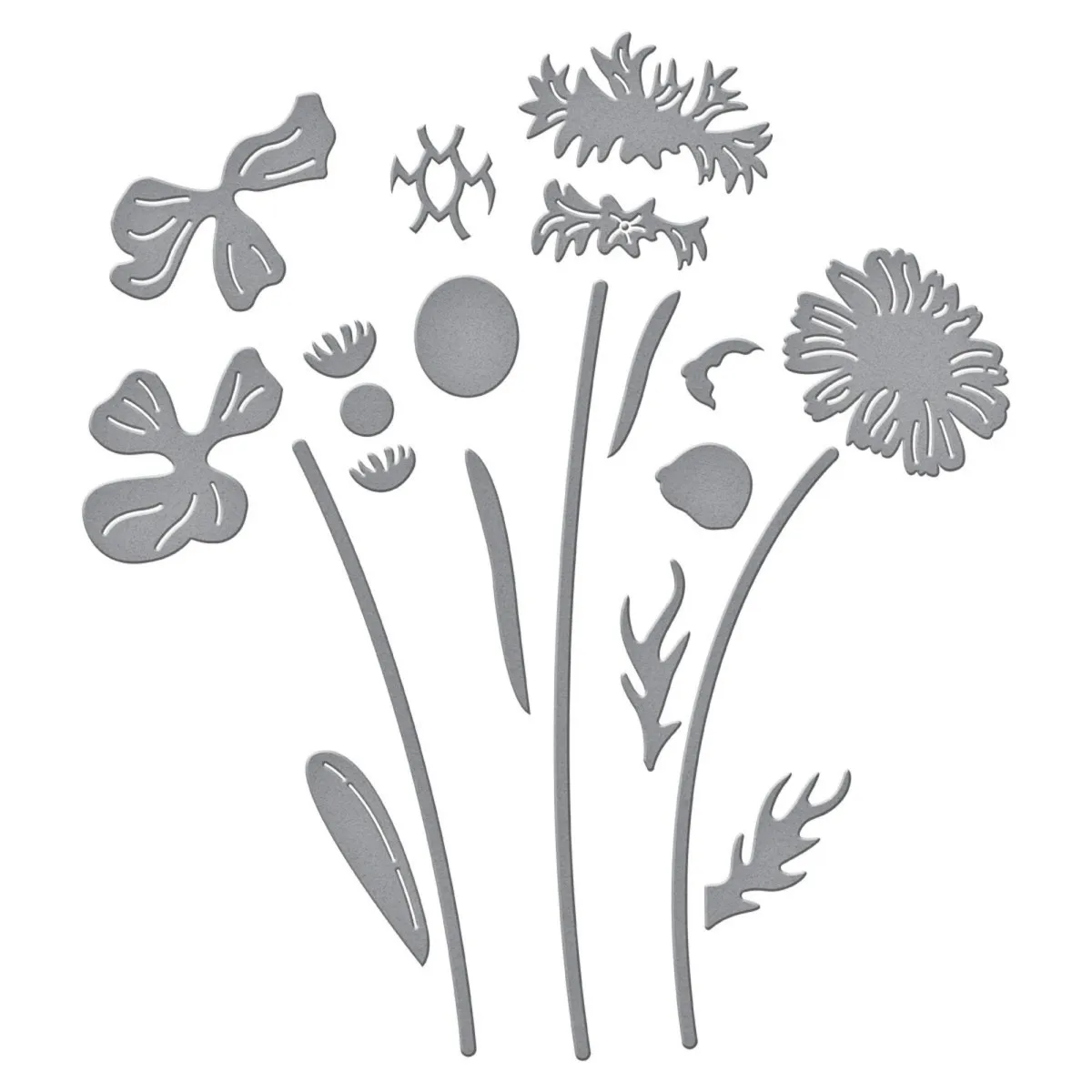 Die Layered Wildflowers Etched Dies sind Teil der Wildflowers Kollektion von Lisa Horton. Dieses Set aus 13 dünnen Metall-Stanzformen schneidet drei verschiedene Arten von Wildblumen: Mohn, Gänseblümchen und Distel. Du kannst sie einzeln verwenden oder mehrere zusammen für einen schönen Wildblumenstrauß schneiden. Der fertige Mohn misst ungefähr 4,20 x 10,40 cm, das fertige Gänseblümchen misst 5,00 x 10,40 cm und die fertige Distel misst 3,70 x 13,00 cm.