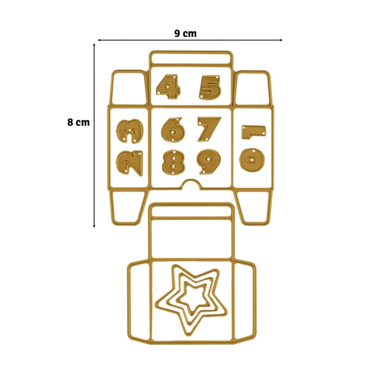 Maße der Schneideschablonen: 9 x 15 cm – 3,7 x 3,7 cm – 2,7 x 2,7 cm – 2 x 2 cm – 1 x 1,2 cm