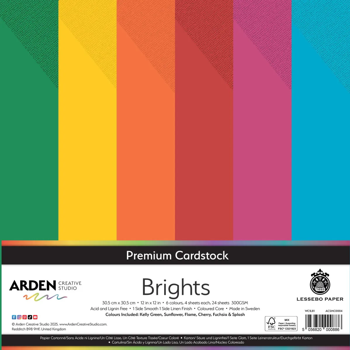 Setze einen lebendigen Farbakzent in deinen Projekten mit dem Premium Brights Cardstock Pack von Arden Creative Studio. Dieses Set in 12x12" Größe (30,5 cm x 30,5 cm) enthält sechs kräftige, dynamische Farben, jeweils vier Bögen pro Farbton – insgesamt 24 Bögen.