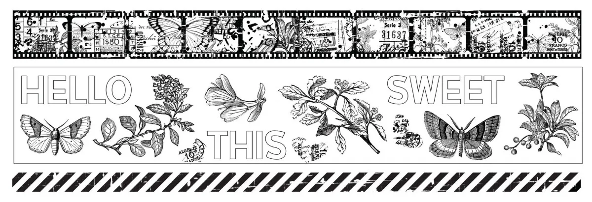 Dieses Set enthält 3 PET-Klebebänder mit den Breiten 5,0 cm, 2,5 cm und 1,0 cm, jeweils 5 m lang und mit einer Loop-Länge von ca. 30 cm. Zwei der Rollen zeigen durchgehende Designs – eine Streifen- und eine Filmstreifen-Variante – und bieten maximale Flexibilität, sodass du genau dort schneiden kannst, wo du es brauchst. Die dritte Rolle ist ein Kiss-Cut-Elementband, gefüllt mit Schmetterlingen, Sprüchen und botanischen Motiven, ideal zum einfachen Layern und Setzen von Blickfängen.