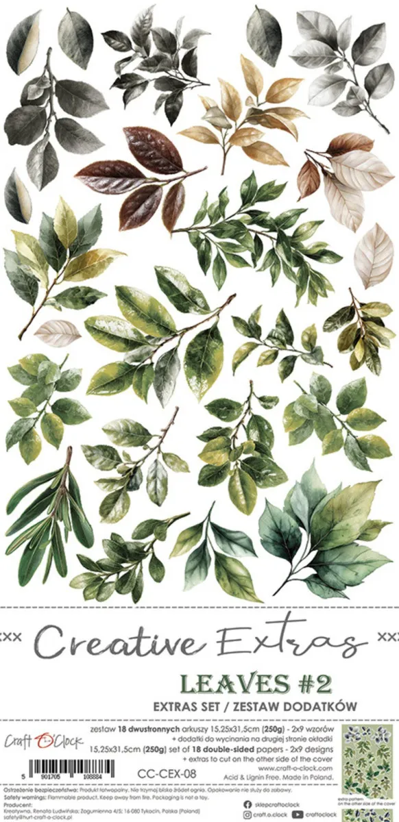 Ein Set aus 18 doppelseitigen Seiten hochwertigem Scrapbooking-Papier mit zusätzlichen Elementen zum Ausschneiden (2x9 Designs) sowie 1 Blatt mit EXTRA ZUM AUSSCHNEIDEN auf der Rückseite des Covers. Jede Seite misst 15,3 cm x 31,5 cm. Das Papier wiegt 250 g/m². Dieses Produkt ist säure- und ligninfrei. Hergestellt in Polen.