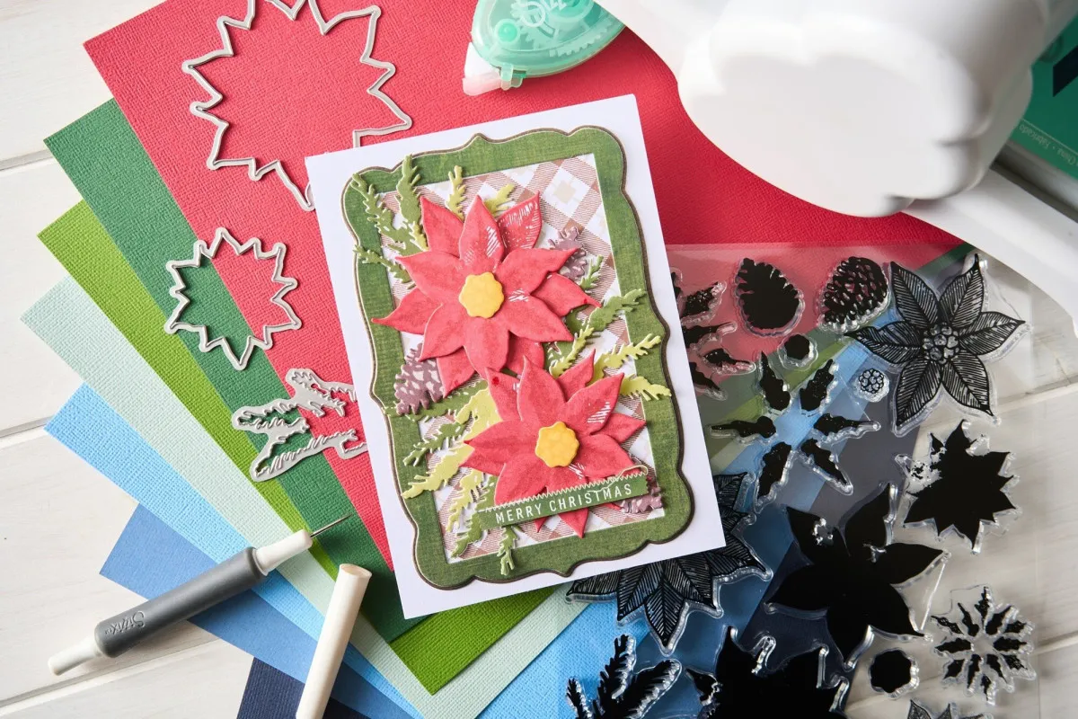 Mit einem wunderschönen Design aus drei Weihnachtsstern-Blüten sowie ergänzenden Elementen wie Zweigen und festlichen Zapfen ist dieses Set perfekt geeignet, um detailreiche Akzente in leuchtenden Farben zu gestalten. Egal ob du Karten, Scrapbook-Seiten oder Dekorationen für dein Zuhause bastelst – diese Stempel und Stanzen passen perfekt zueinander und bringen den Zauber von Weihnachten direkt in deine Projekte!