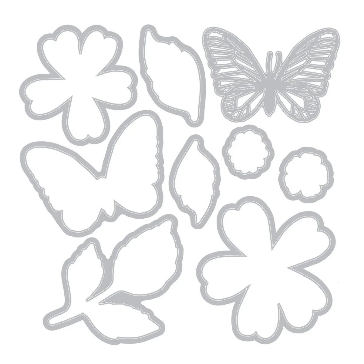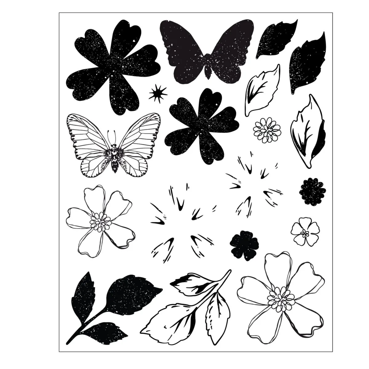 Mit diesem Set kannst du detaillierte, mehrschichtige botanische Designs mit sauberem, präzisem Ergebnis erstellen. Die Stempel zeigen zarte Blumen, Zweige und einen Schmetterling und können entweder allein für zusätzliche Textur verwendet oder zusammen mit den Framelits-Stanzschablonen zum Ausschneiden der gestempelten Motive genutzt werden.