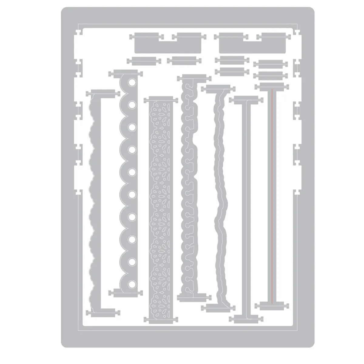 Mit diesem Snap and Swap Set gestaltest du handgemachte Journals aus Karton, gemustertem Papier, Vellum und anderen Materialien. Das Set enthält austauschbare Randdesigns wie gewellt, eingerissen und spitzenartig, sodass du die Elemente beliebig kombinieren kannst. Die einzelnen Teile lassen sich ganz einfach in deine Stanzschablone einsetzen und wieder herausnehmen, damit du deine Projekte vollständig personalisieren kannst.
