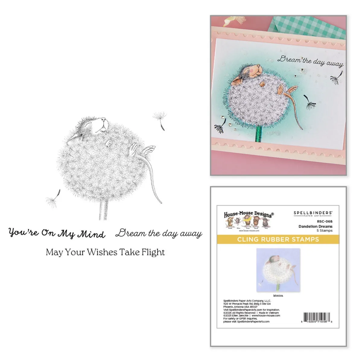 Das Dandelion Dreams Cling Stamp Set ist Teil der House-Mouse Party Parade Kollektion. Monica macht ein Nickerchen auf einer gemütlichen Pusteblume, während ein Löwenzahnsamen nach unten davonfliegt. Neben dem Hauptmotiv enthält das Set fünf Stempel, darunter einen Samen und drei Sprüche: „Dream the day away“, „You're on My Mind“ und „May Your Wishes Take Flight“. Die Stempel sind für die Verwendung mit einem Acrylblock konzipiert.
