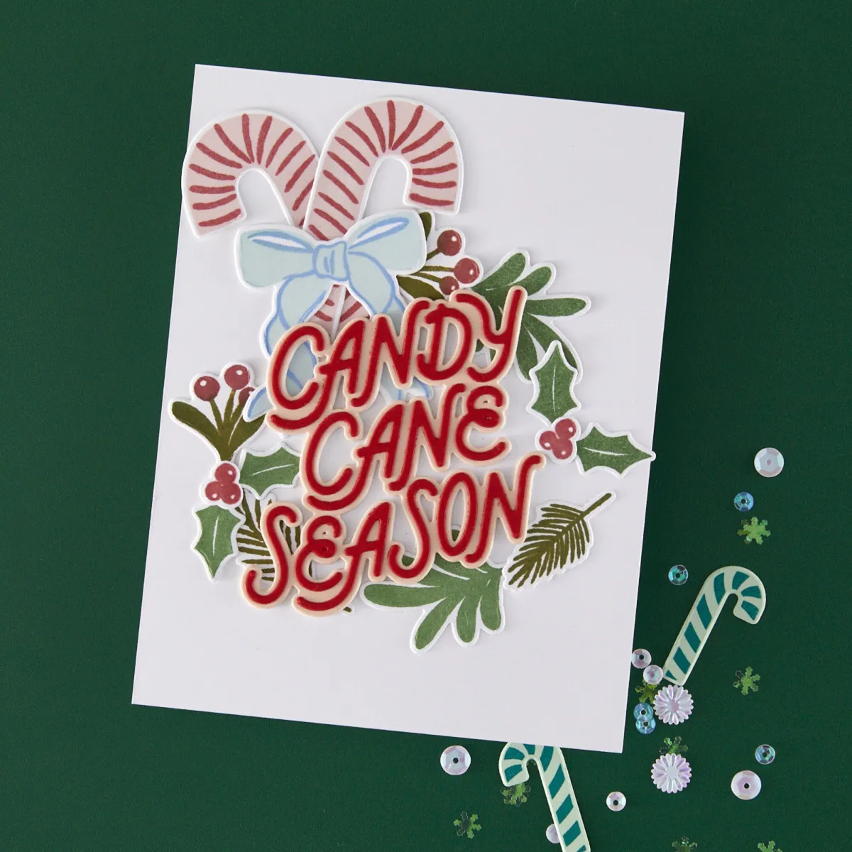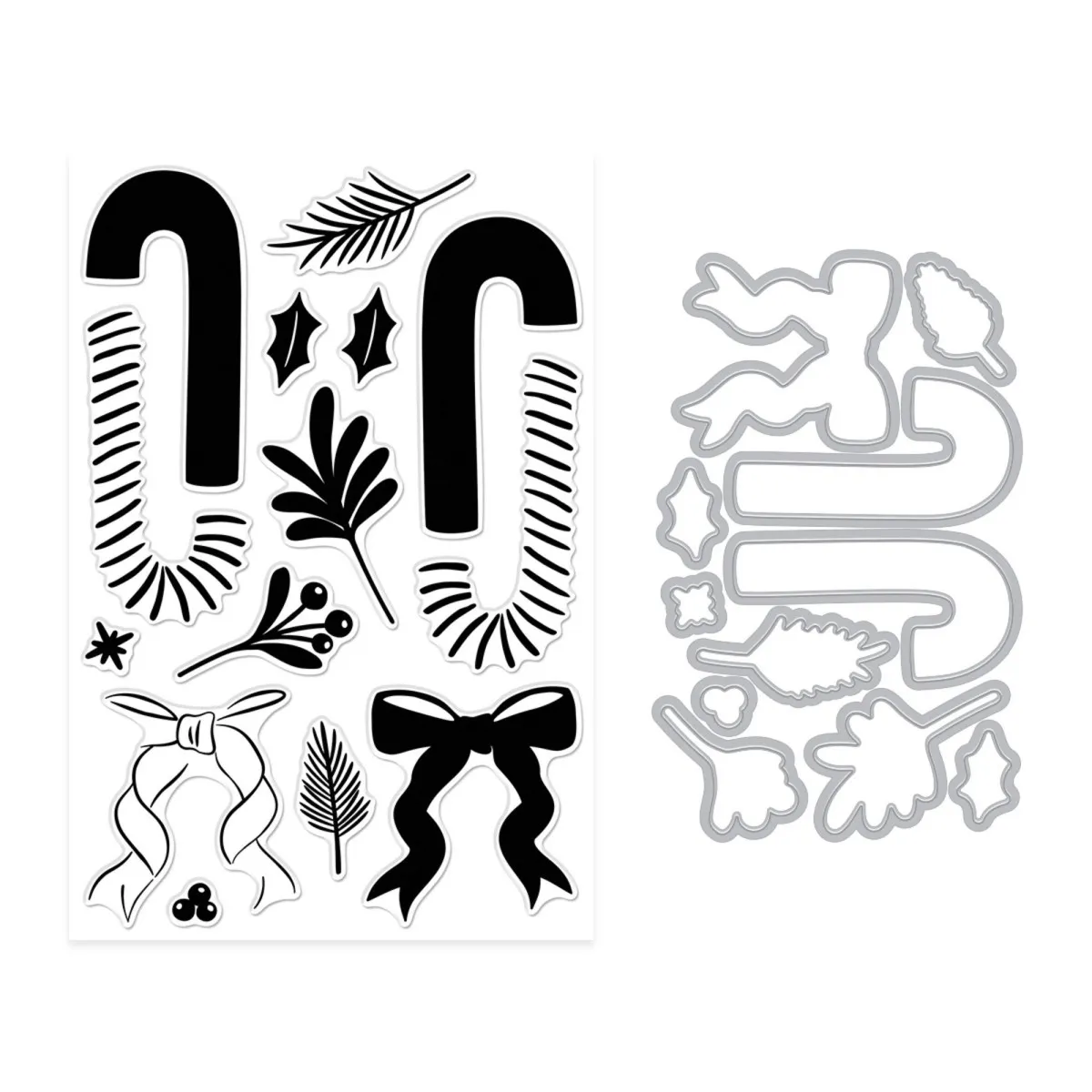Lege zwei Zuckerstangen zu einem süßen Kreuz zusammen, rahme sie mit Tannenzweigen und Stechpalmenblättern ein und setze eine charmante Schleife als zeitloses Weihnachtsmotiv oben drauf. Ob du Karten, Anhänger oder Geschenkdekorationen bastelst, dieses Set bringt dir gemütliche, harmonische Schönheit in all deine Weihnachtsprojekte.