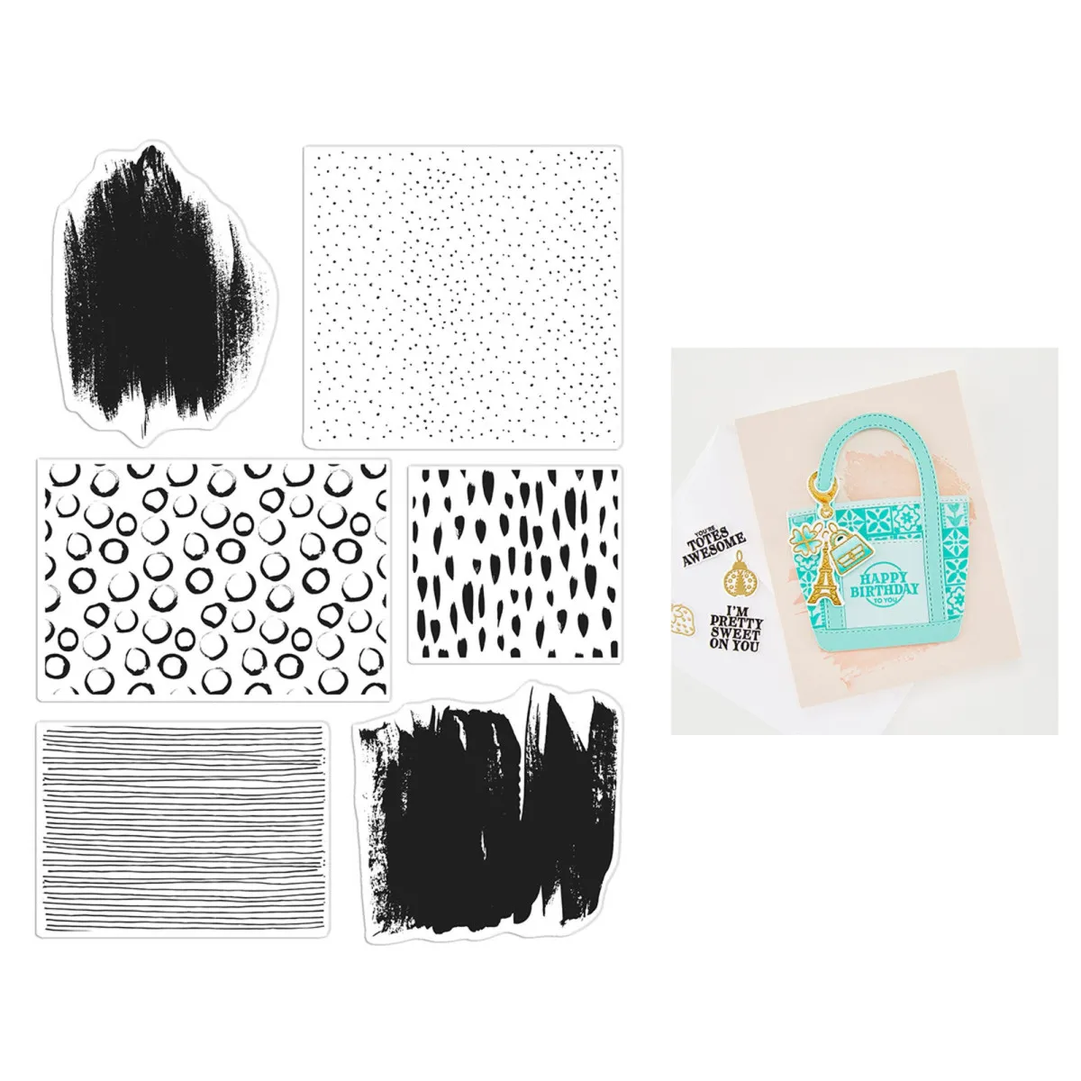 Verleihe deinen Projekten mit dem Background Builder Clear Stamp Set Textur, Tiefe und Persönlichkeit. Dieses vielseitige Set bietet eine Mischung aus organischen Mustern, Farbstrichen und grafischen Texturen, die sich wunderbar als Basiselemente auf Karten eignen.