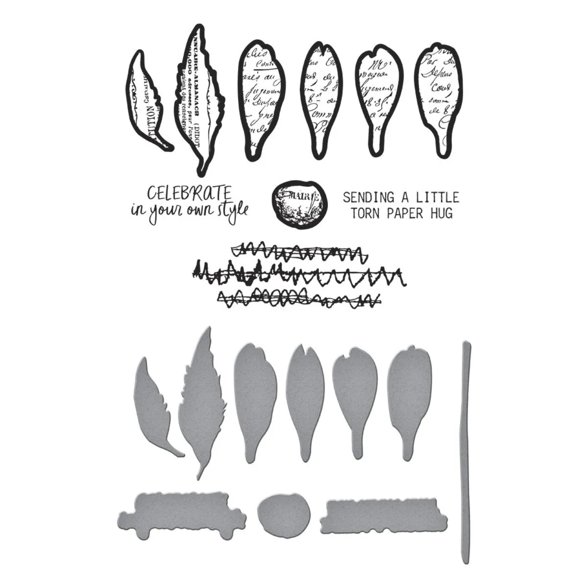 Das Set Sculpted Scripted Floral Clear Stamp & Die Set ist Teil der Beautifully Imperfect Collection. Dieses Set besteht aus 10 Clear Stamps und 10 filigranen Stanzschablonen aus Metall. Sieben der Stempel und die dazu passenden Stanzen ergeben zusammen eine wunderschön geschwungene Blume. Außerdem enthält das Set eine Stanzform für den Stiel sowie zwei Textstempel mit passenden Stanzen: Sending a Little Torn Paper Hug und Celebrate in Your Own Style. Der zehnte Stempel zeigt ein dekoratives, unregelmäßiges Linienmuster.