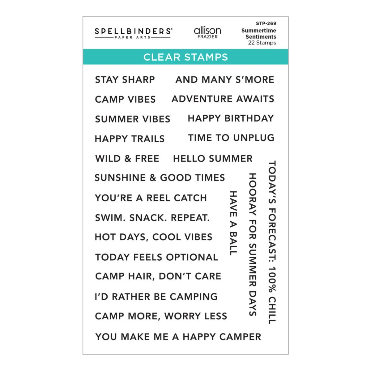 Das Summertime Sentiments Clear Stamp Set ist Teil der Summer Camp Kollektion von Allison Frazier und verleiht der Kollektion mit 22 Sprüchen eine ganz persönliche Note! Die Sprüche reichen von camping-typischem Witz über Sommer-Vibes bis hin zu unbeschwerten Gedanken. Sie werden in den USA aus hochwertigem Polymer hergestellt, um jedes Mal perfekte Abdrücke zu garantieren. Sie sind für die Verwendung mit einem transparenten Stempelblock konzipiert.