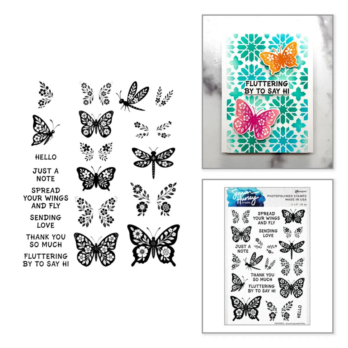 Das Blooming Butterflies Stempel- und Stanzformen-Bundle von Simon Hurley enthält die S5-754 Blooming Butterflies Stanzformen sowie das HUR93572 Blooming Butterflies Clear Stempelset. Kombiniere beides, um die wunderschönen Schmetterlinge und Libellen perfekt auszustanzen und sie in deinen Papierprojekten zum Leben zu erwecken!