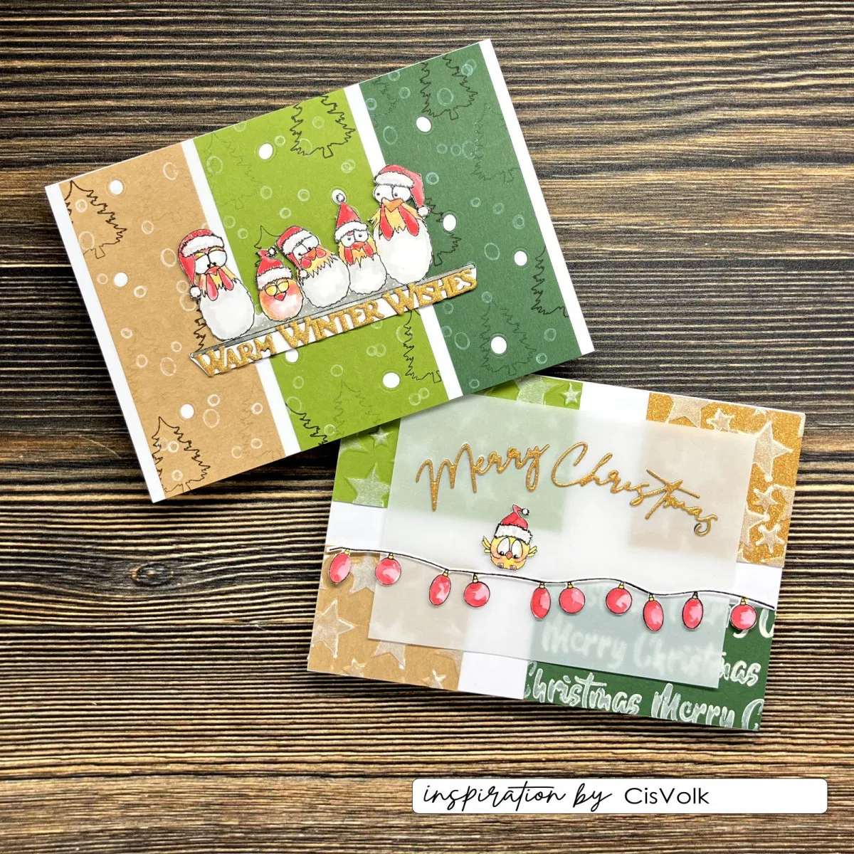 Stemple Weihnachtshühner auf deine Karten und Scrapbook-Seiten mit den Silikonstempeln von Vaessen Creative. Sie wurden von der Illustratorin Carla Creates entworfen, die fröhliche Zeichnungen, Karten und Porträts mit Bleistift, Tinte und Farbe anfertigt. Die transparenten Stempel (auch Klarsichtstempel oder auf Englisch Clear Stamps genannt) bestehen aus hochwertigem Photopolymer und liefern dadurch scharfe und detailreiche Abdrücke – ideal für all deine Papercraft-Projekte. Dank des durchsichtigen Materials kannst du den Stempel ganz genau platzieren. Verwende sie zum Kartenbasteln, Scrapbooking, Journaling und anderen kreativen Projekten. Du kannst die Stempel kombinieren, mit einer Stempelhilfe, einem Acrylblock oder Tack ‘N Peel-Bögen (05TP001). Sie sind mit verschiedenen Tintenarten kompatibel, darunter Dye-Tinte, Pigmenttinte und wasserbasierte Tinten.
