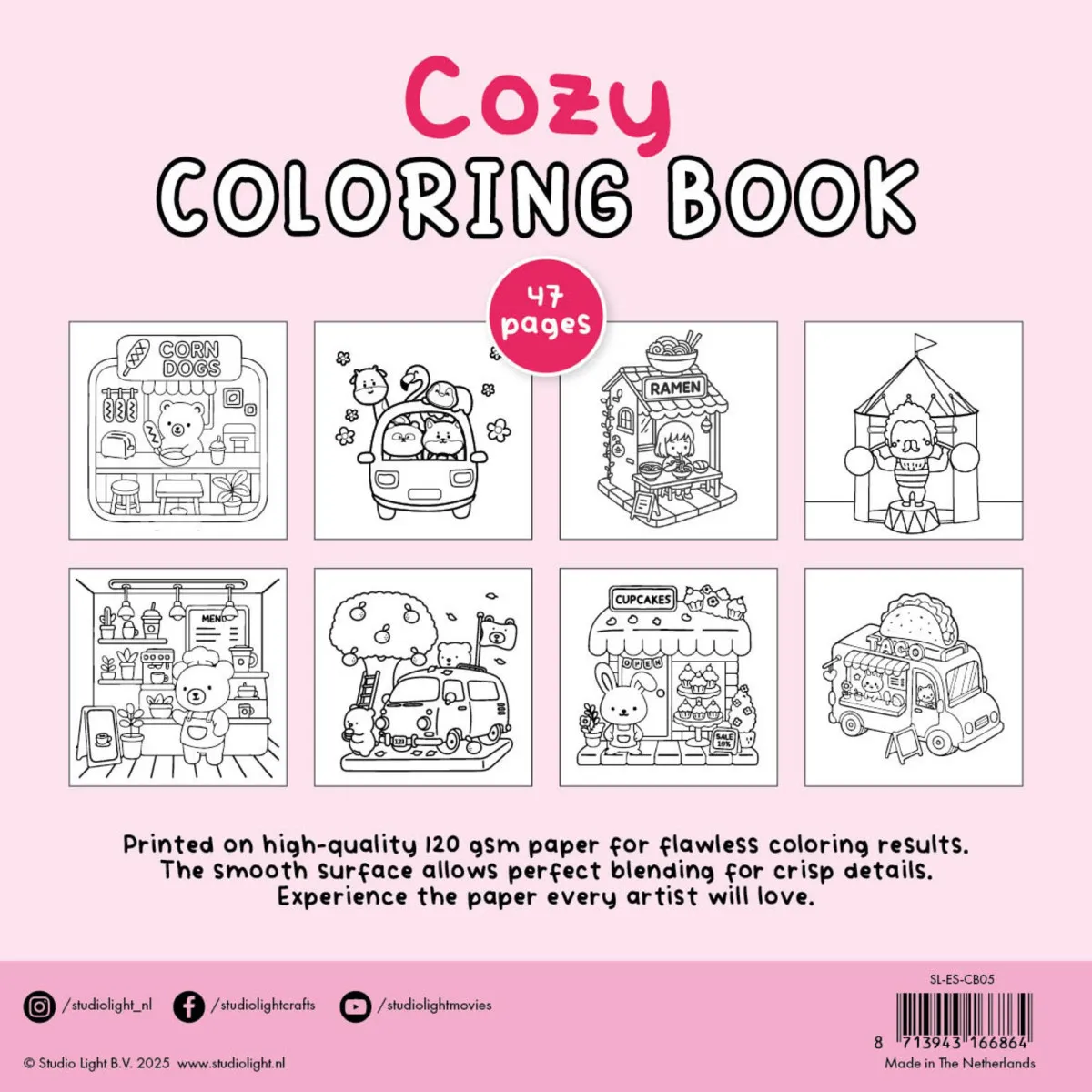 Essentials by Studio Light. Cozy Coloring Book. 200 × 200 × 7 mm. 47 Seiten. 120 g/m². Perfekt für Marker.