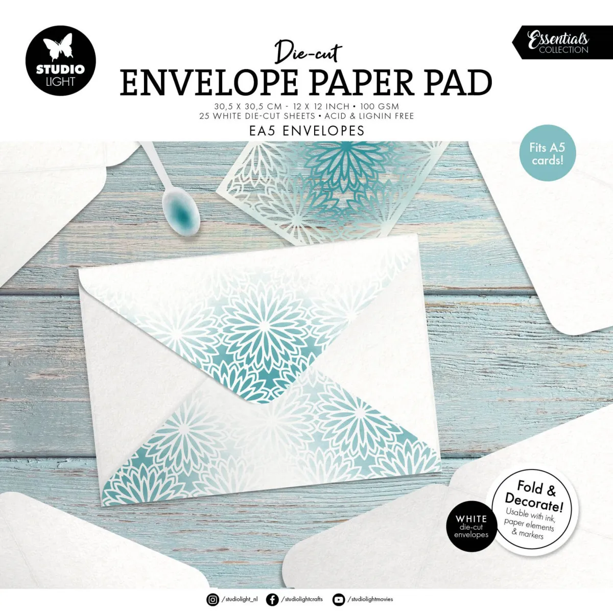 Essentials by Studio Light. Stanzpapier-Block für Umschläge EA5 für A5-Karten. Weiß. 30,5 x 30,5 x 0,7 cm. 25 Blatt.