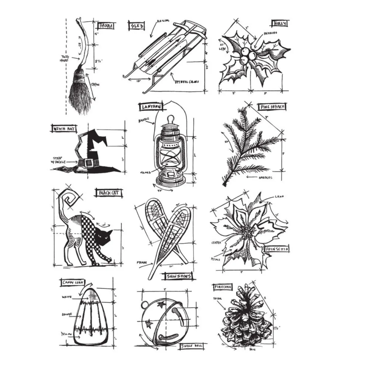 Zwölf tief geätzte Cling-Stempel aus rotem Gummi, die auf jedem klaren Acrylblock haften. Du kannst sie besonders gut mit Tim Holtz Grid-Blocks verwenden.