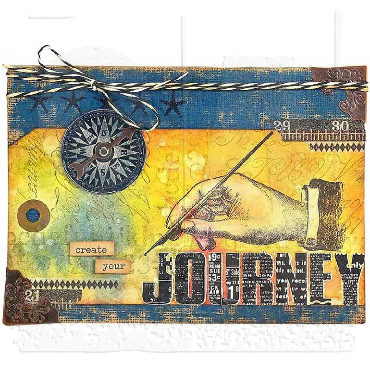 Sechs tief geätzte Cling-Stempel aus rotem Gummi, die auf jedem klaren Acrylblock haften. Du kannst sie besonders gut mit Tim Holtz Grid-Blocks verwenden.